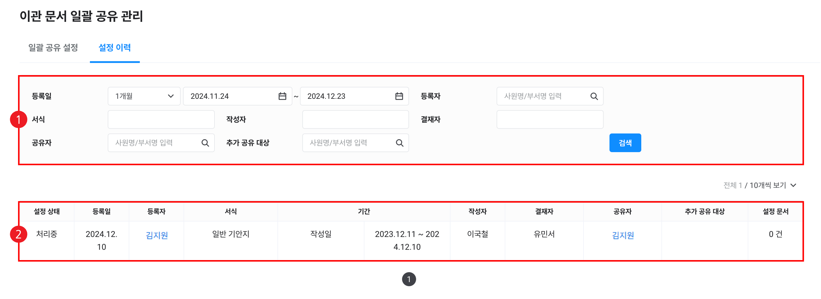 | ① 검색 영역 | 일괄 공유 대상 설정 이력을 등록일, 등록자, 서식, 작성자, 결재자, 공유자, 추가 공유 대상으로 검색 |