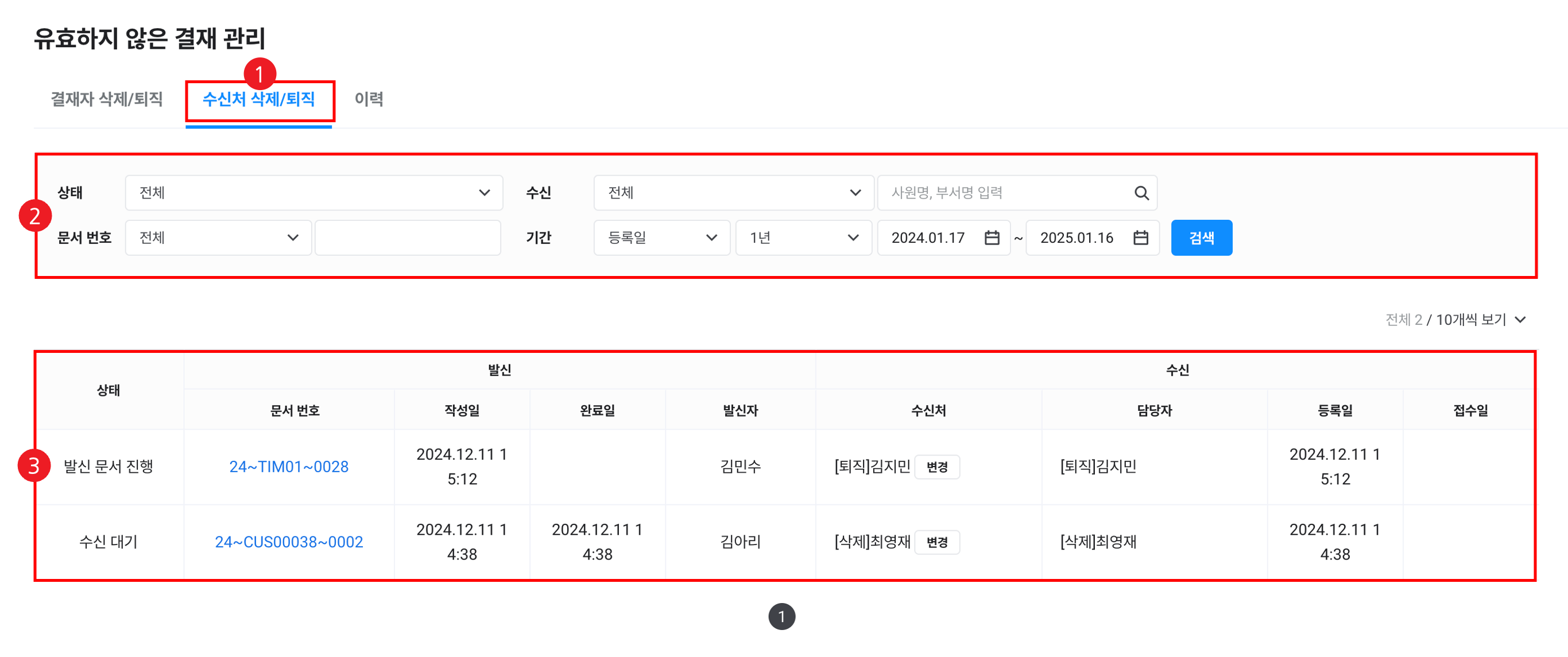 | ① 콘텐츠 탭 | 클릭하여 삭제/퇴직한 문서 수신처 조회 |