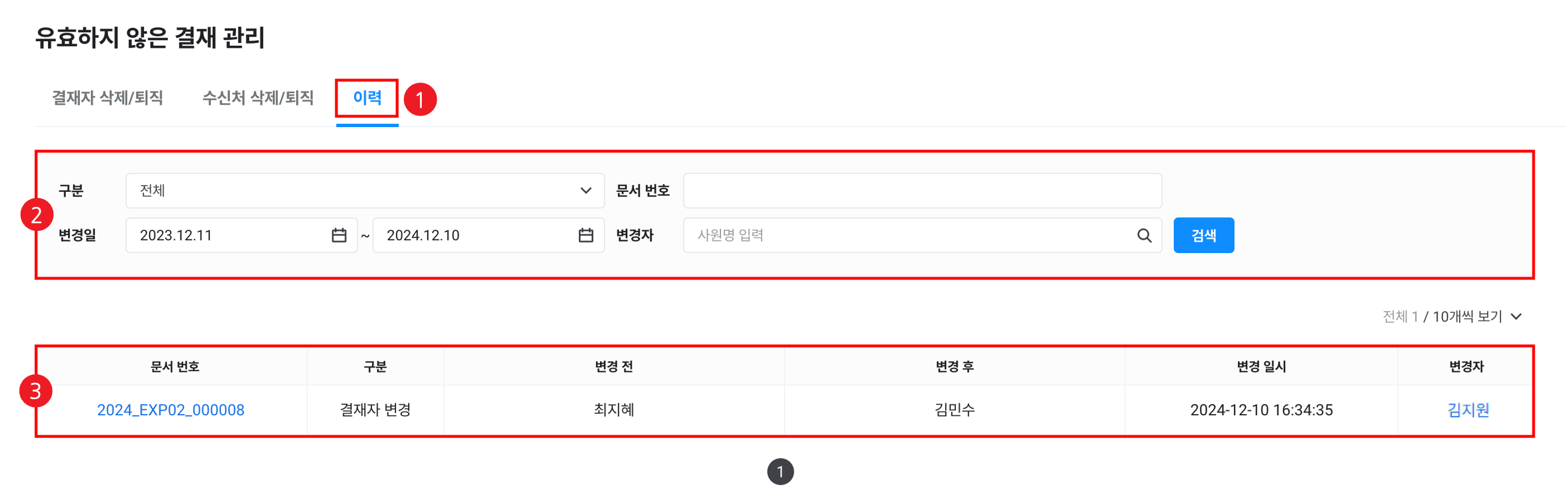 유효하지 않은 결재선, 수신처, 담당자 변경 이력을 조회할 수 있습니다.