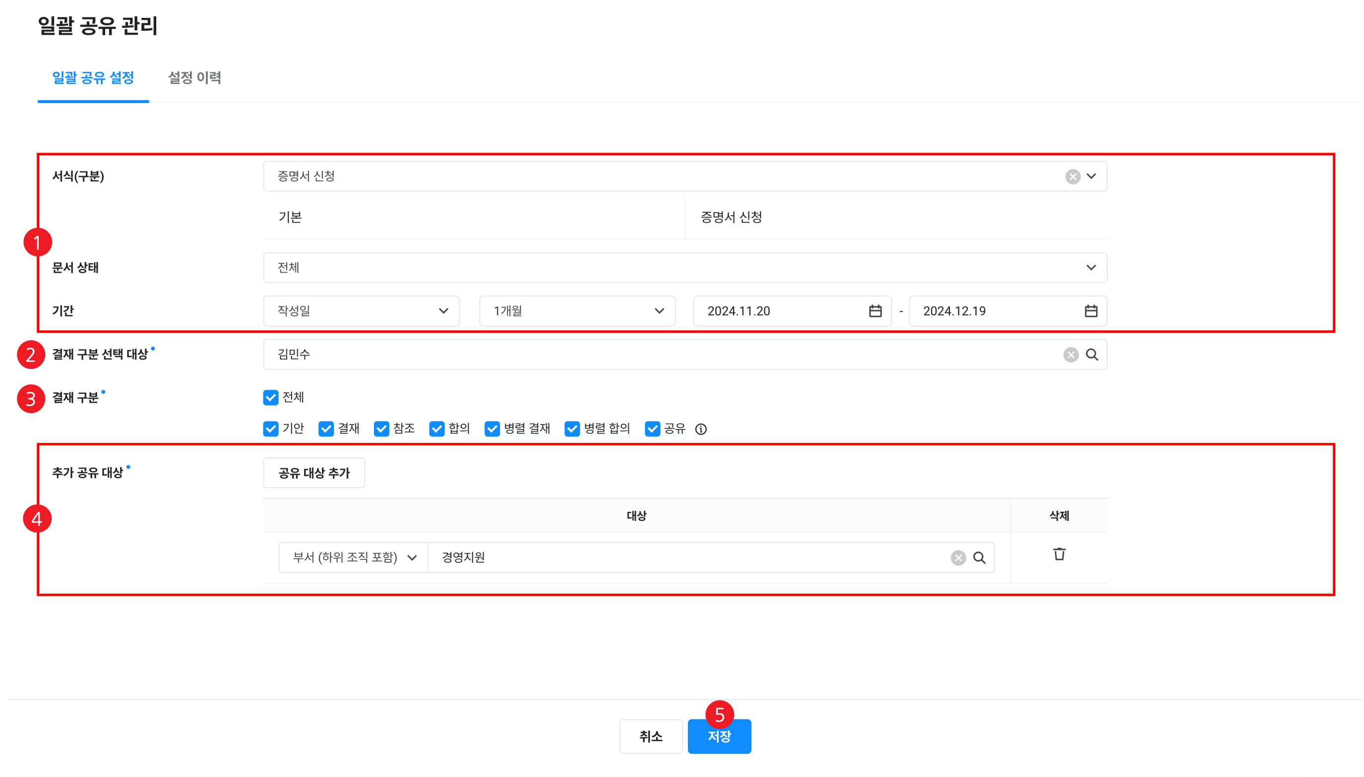 | ① 검색 영역 | 일괄 공유 대상 설정 이력을 등록일, 등록자, 서식(구분), 결재 구분 선택 대상, 추가 공유 대상으로 검색 |