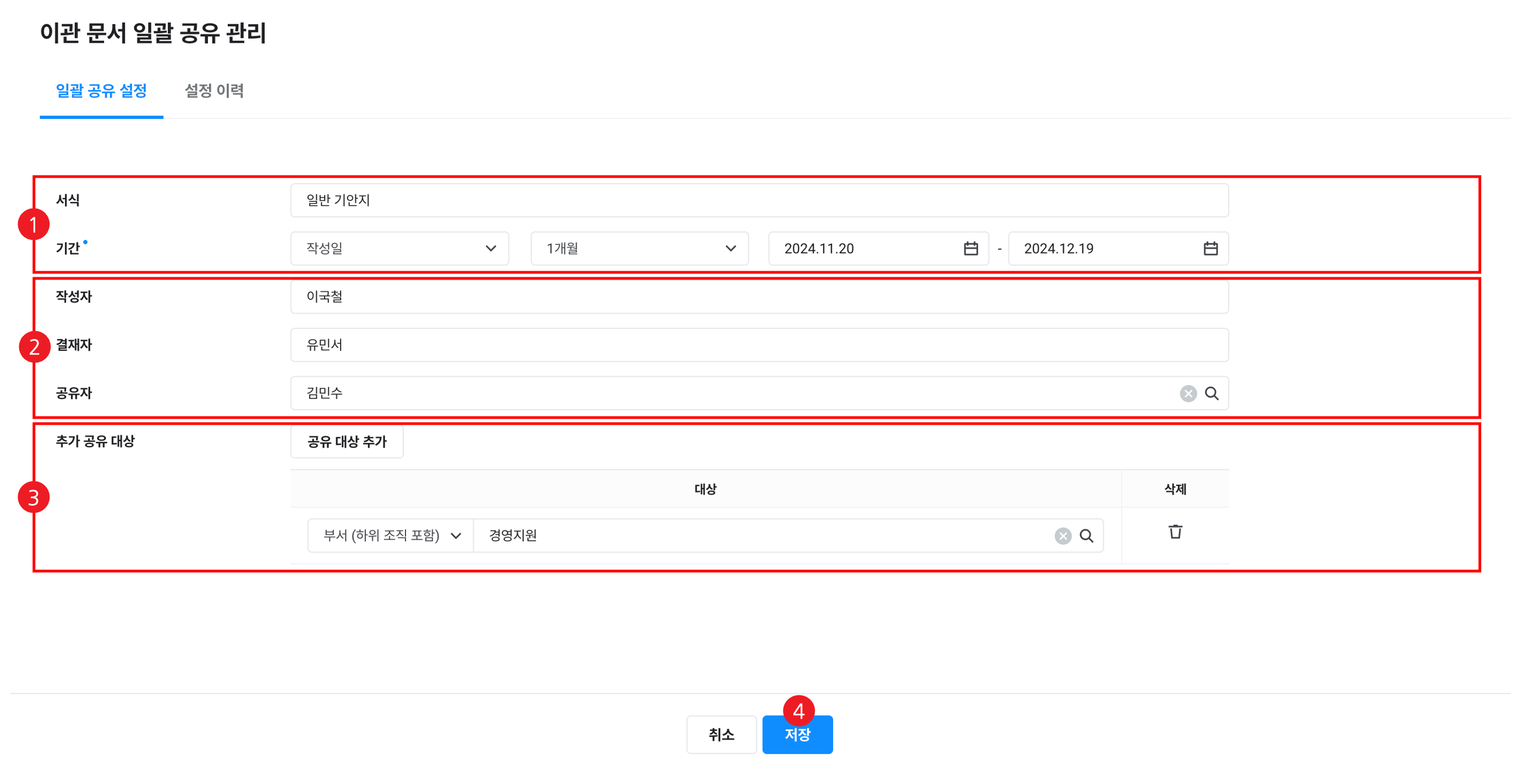 | ① 문서 정보 영역 | 공유 권한을 부여할 서식, 기간(작성일, 완료일) 입력 |