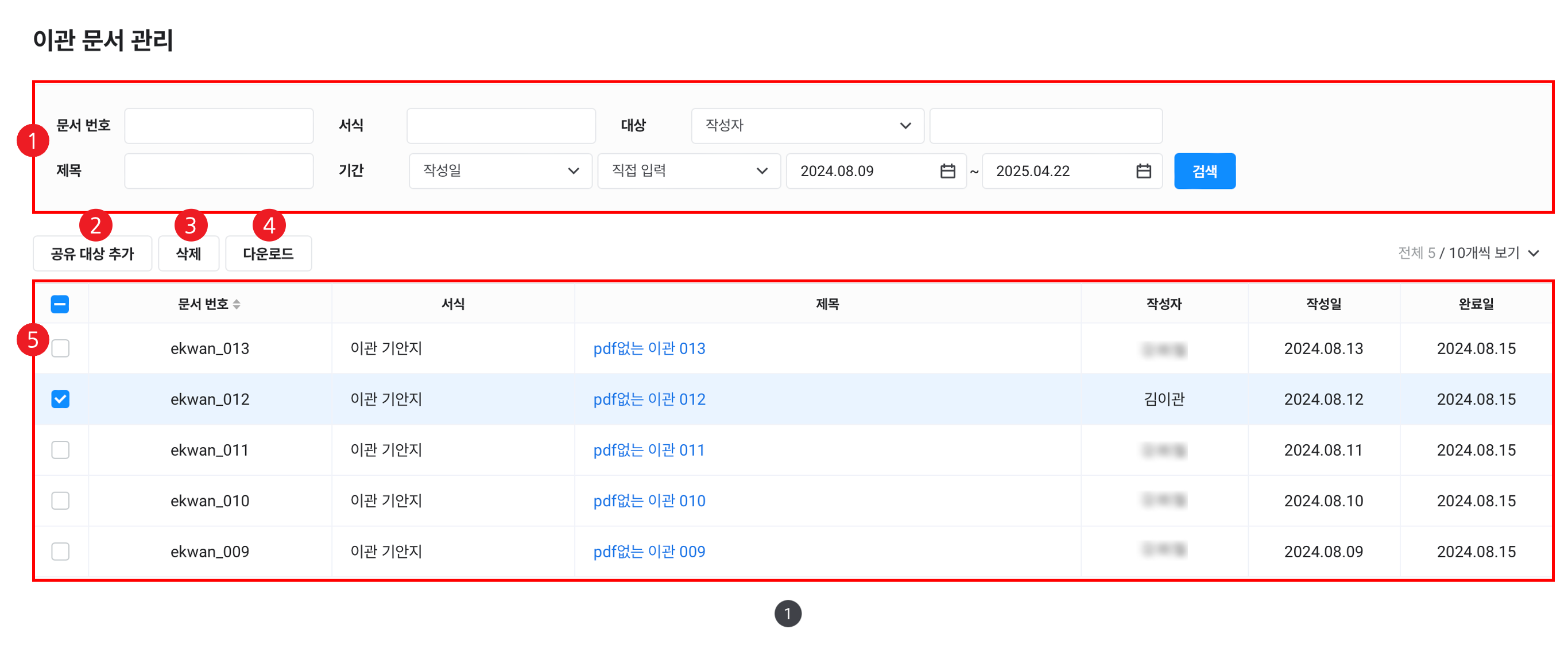 | ⑤ 이관된 문서 목록 | 이관된 문서를 목록으로 확인