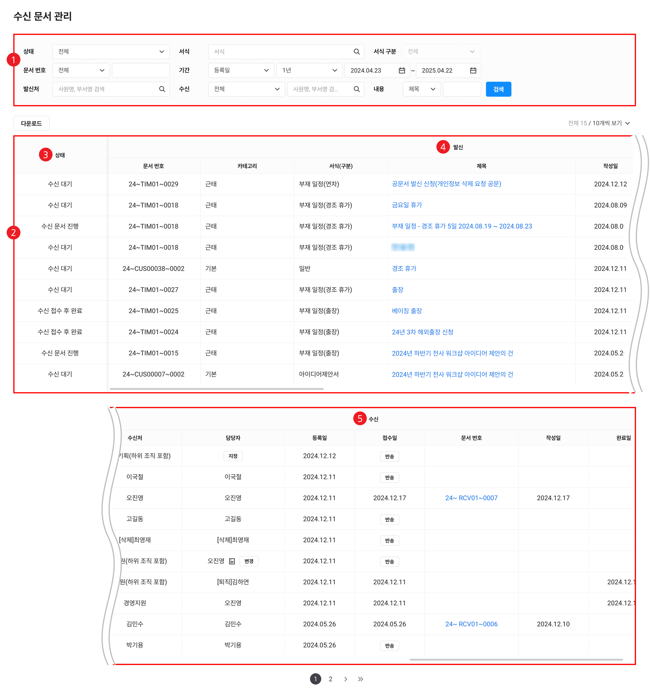- 입력한 조건에 해당하는 수신 문서 목록이 조회됩니다.