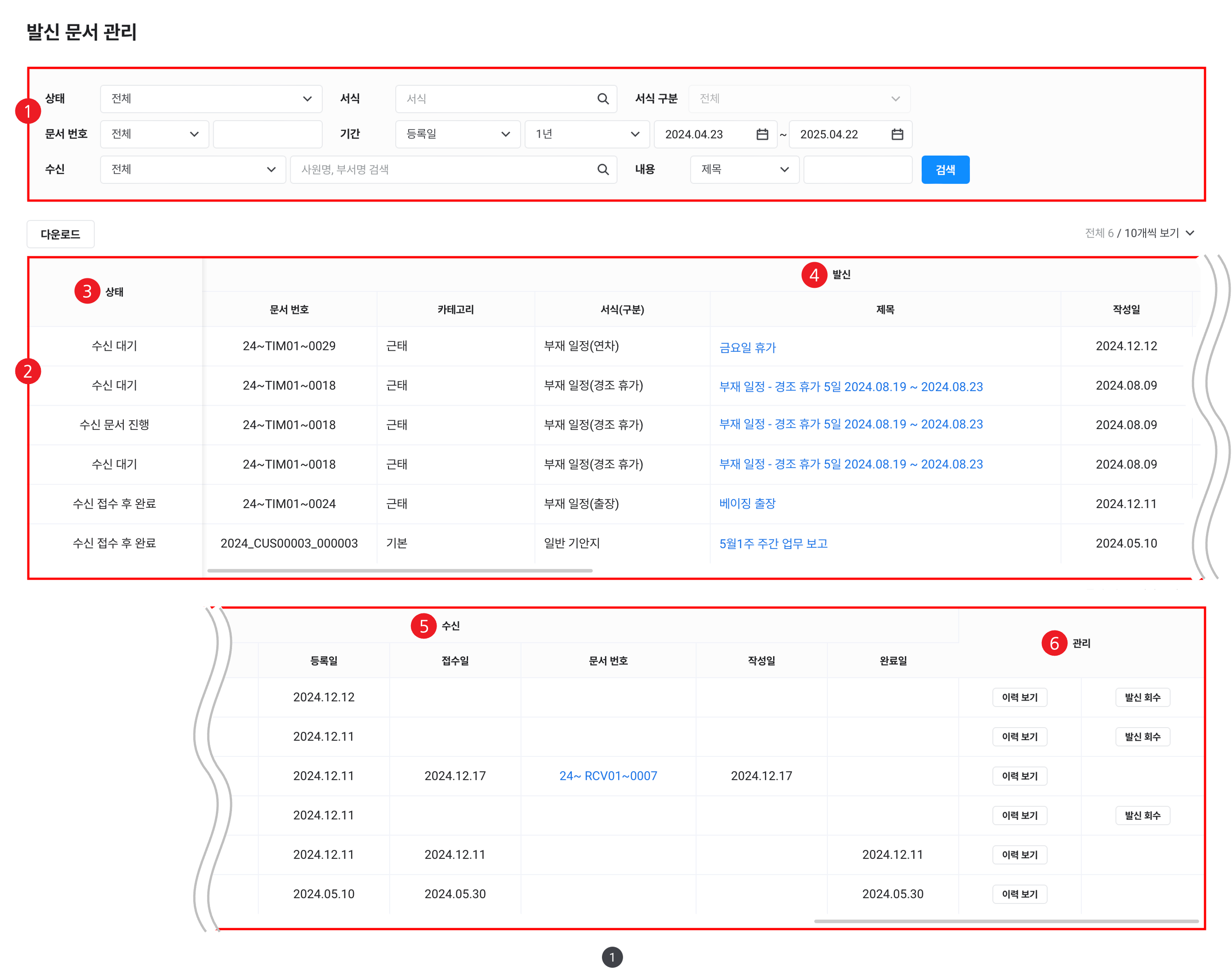 | ① 검색창 | 문서를 상태, 서식, 서식 구분, 문서 번호, 기간, 발신처, 수신(수신처/담당자), 내용 조건에 따라 검색