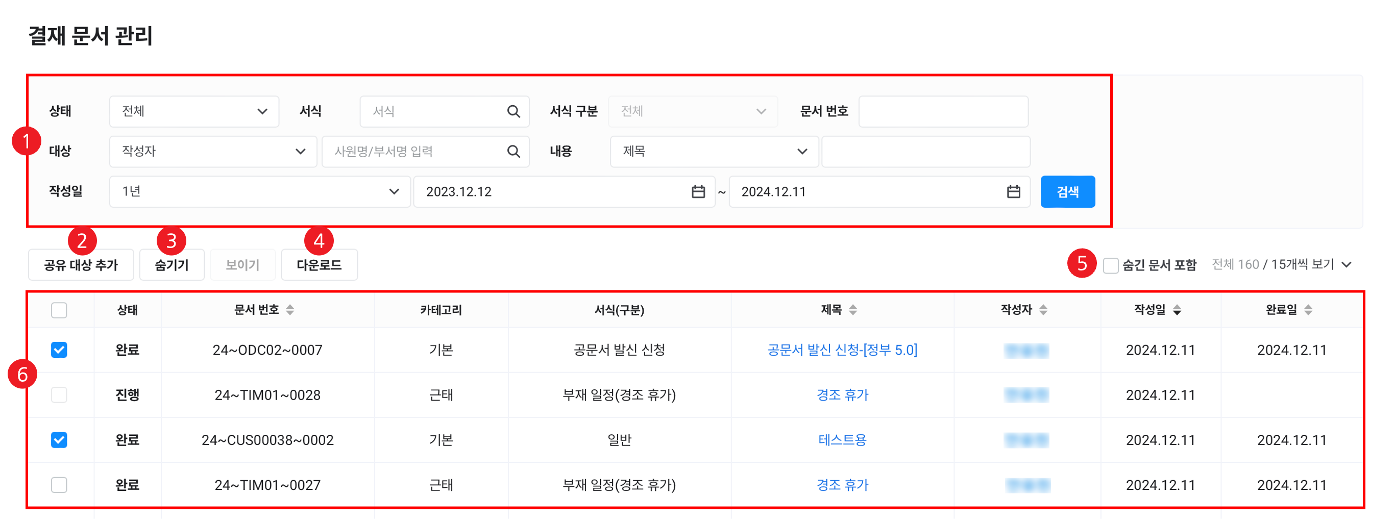 | ⑤ 숨긴 문서 포함 | 숨긴 결재 문서를 목록에 표시 |
