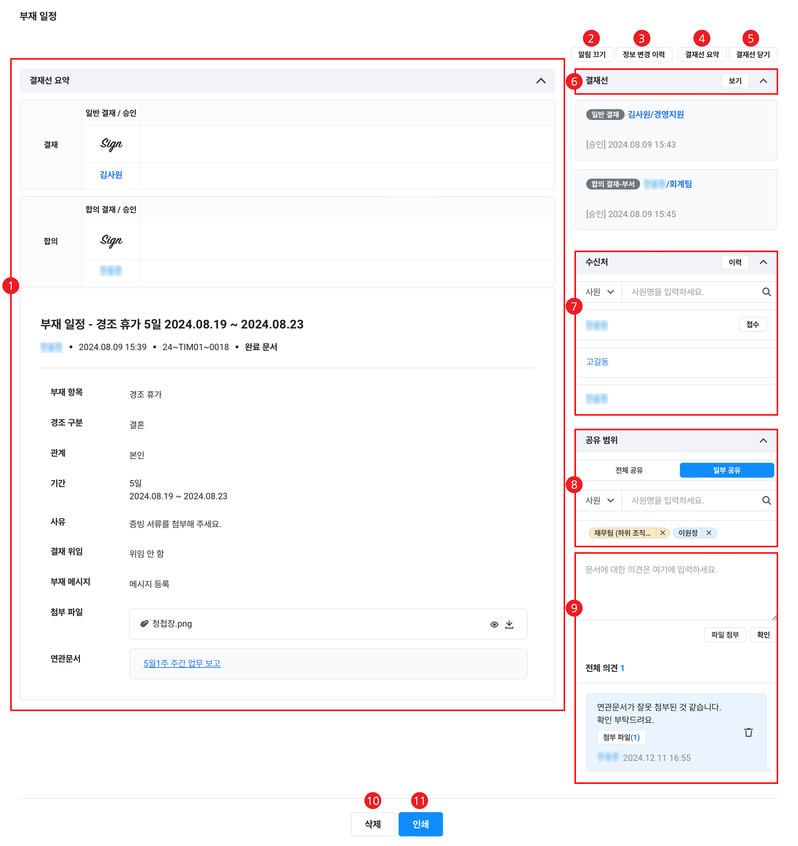 각 결재 문서의 상세 내용을 확인하고 결재선 또는 공유 범위를 변경할 수 있습니다. 필요한 경우 문서를 삭제할 수 있습니다.