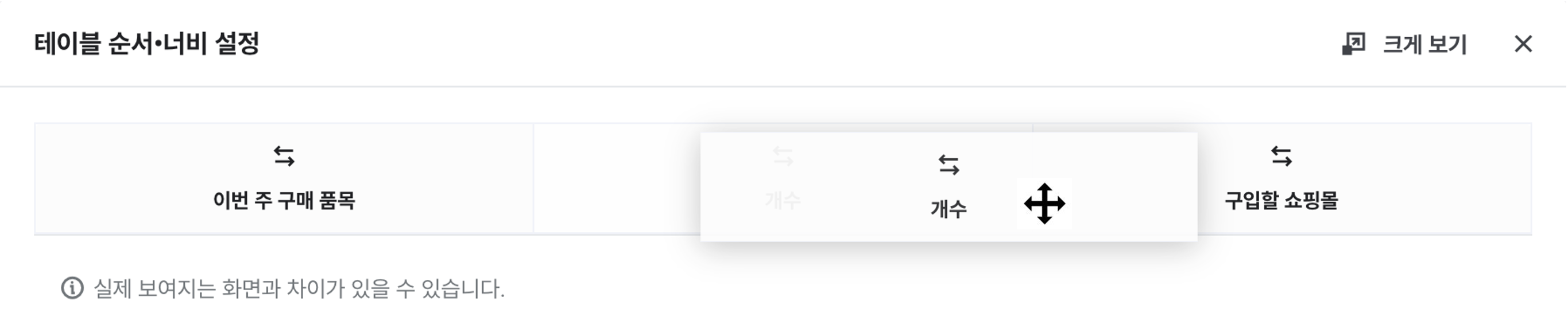 카테고리명 행에 마우스를 올리면 순서 변경 아이콘 표시되며, 원하는 순서에 마우스로 끌어다 이동 가능