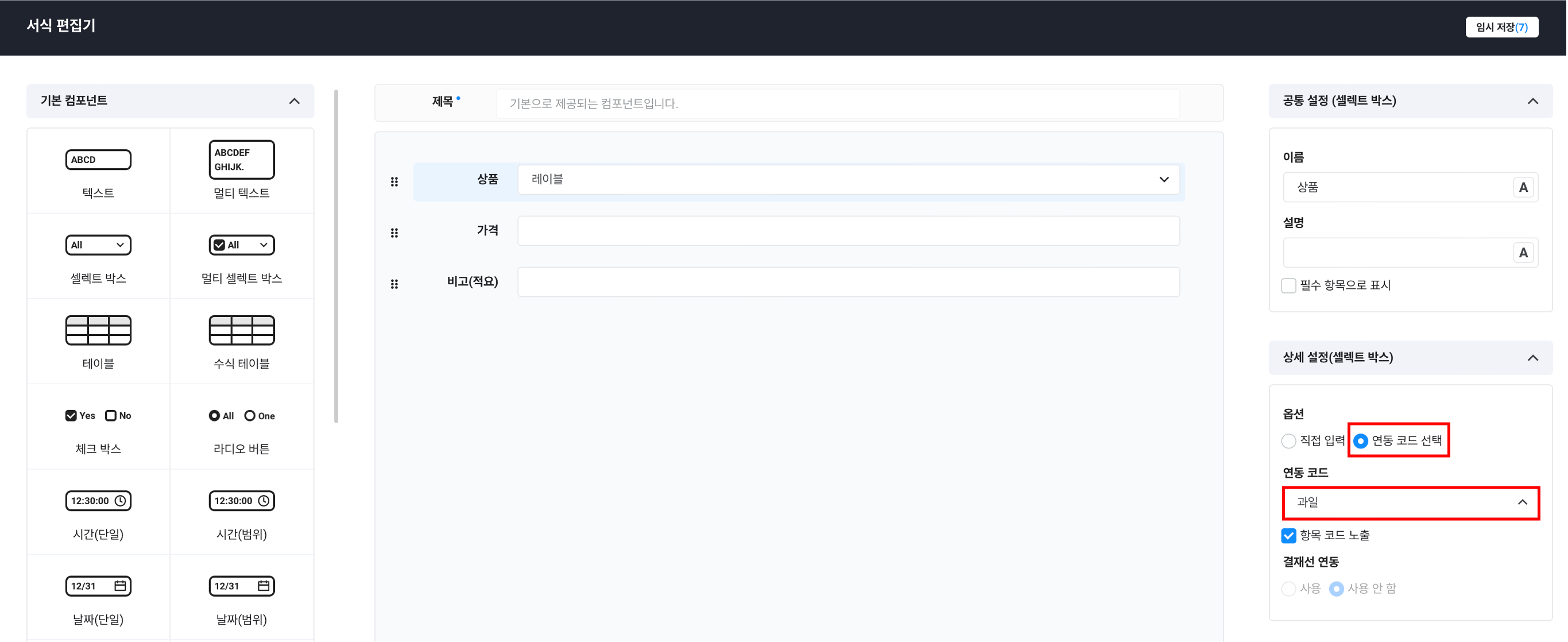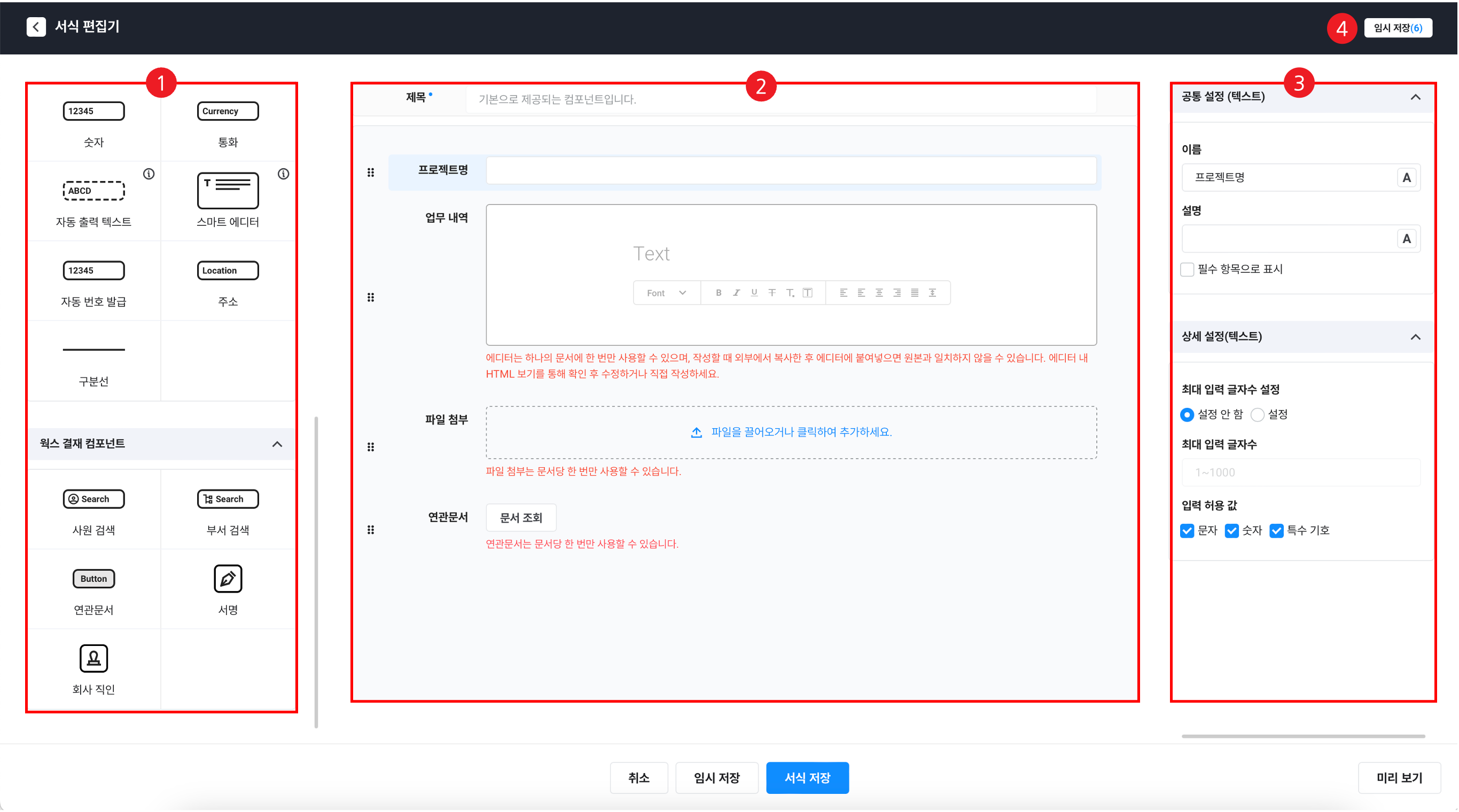 • 웍스 결재로 전송할 전체 데이터에 대해 형식별로 컴포넌트를 추가하여 서식을 편집합니다.