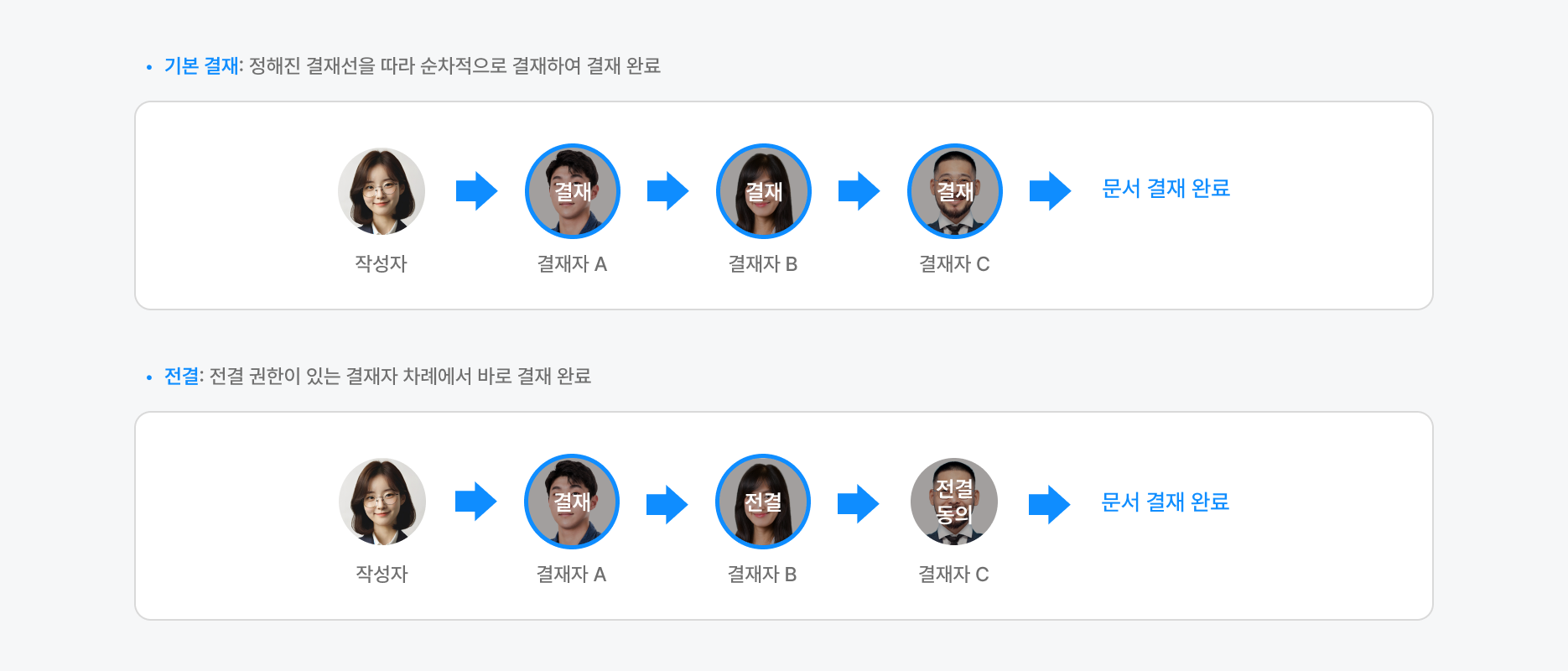 • 결재자 변경: 선택한 결재자가 대신하여 결재하며 원결재자에게 알림 전송
