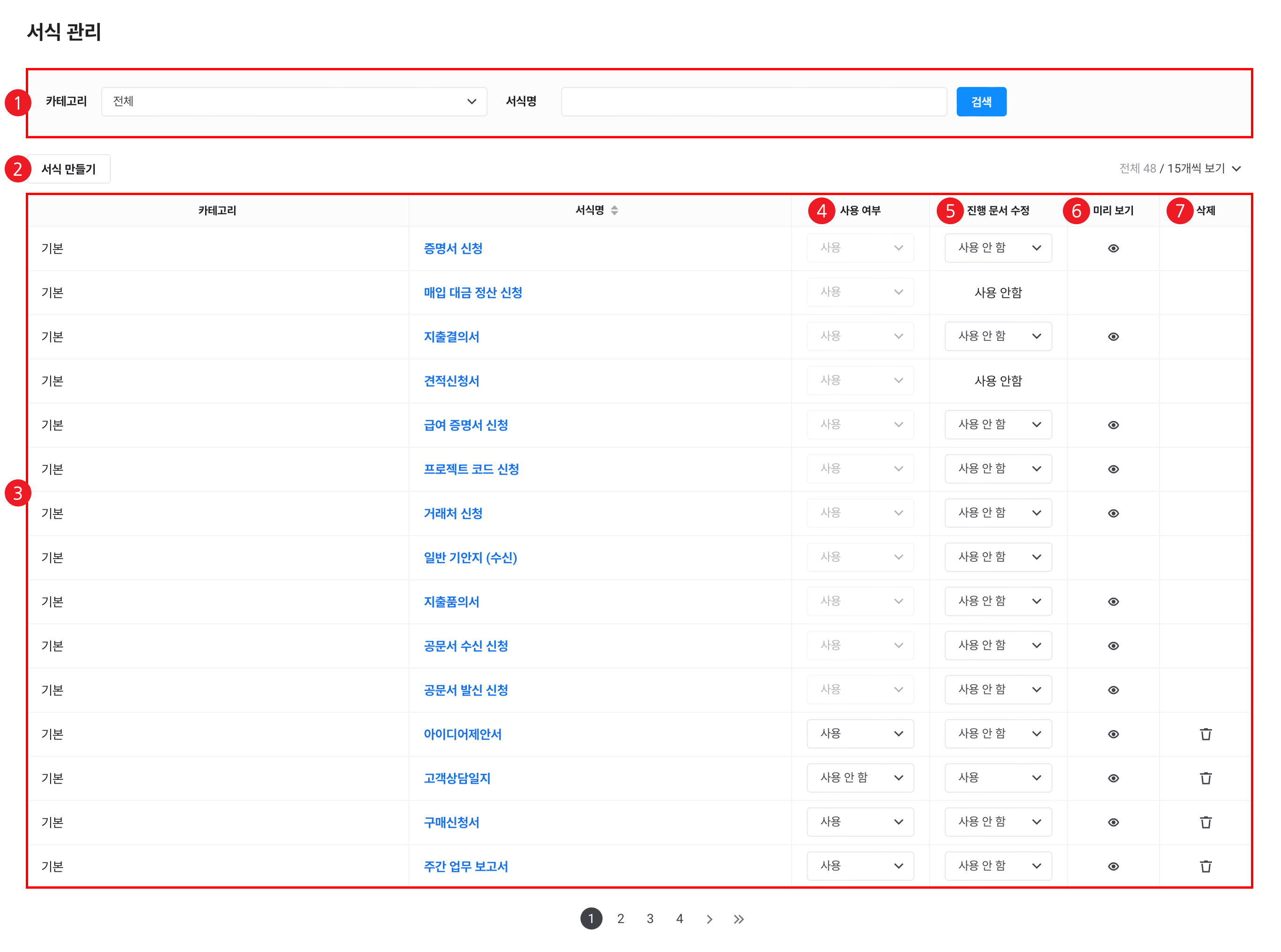 ③ 서식 목록 기본 제공 및 회사가 생성한 서식 목록 확인 및 관리