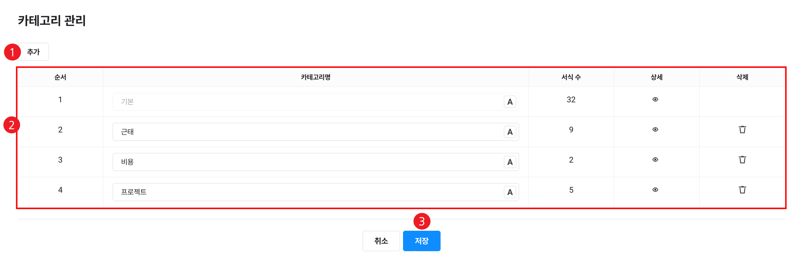 카테고리명 열에서 카테고리의 이름을 추가 및 수정할 수 있으며, 각 열의 아이콘을 클릭하여 상세 보기, 삭제 가능