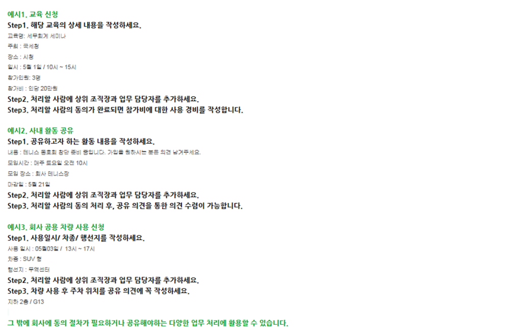 부재 일정, 근무 결과 신청, 비용 정산 신청 등 일반적인 업무를 위한 서식이 기본으로 제공되며, 필요한 경우 회사의 업무 목적에 맞는 서식을 직접 생성하여 사용할 수 있습니다.