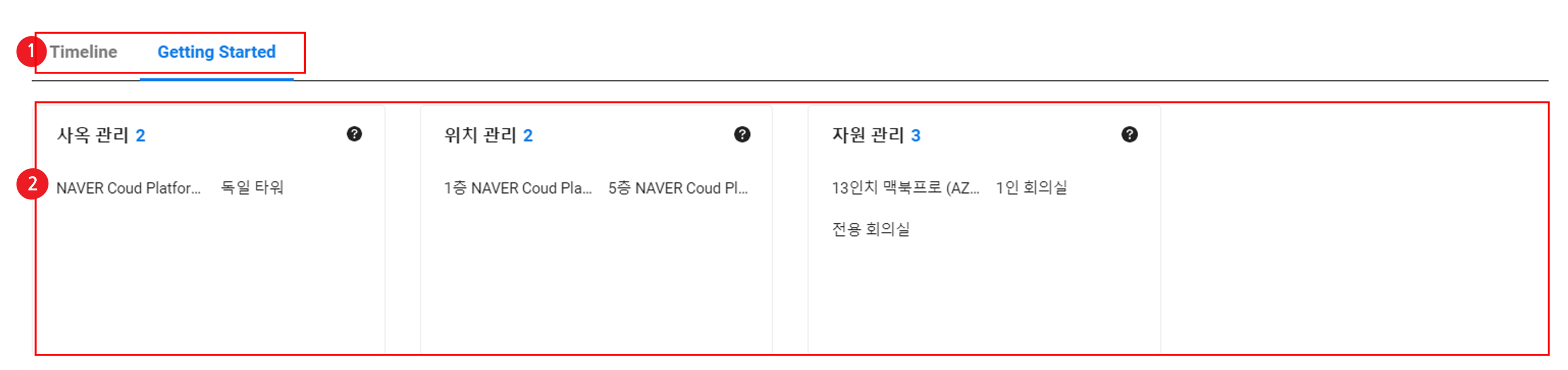 자원 예약 서비스를 원활히 사용하기 위해서는 Getting Started 화면의 카드 순서에 따라 모든 항목의 설정을 완료합니다.