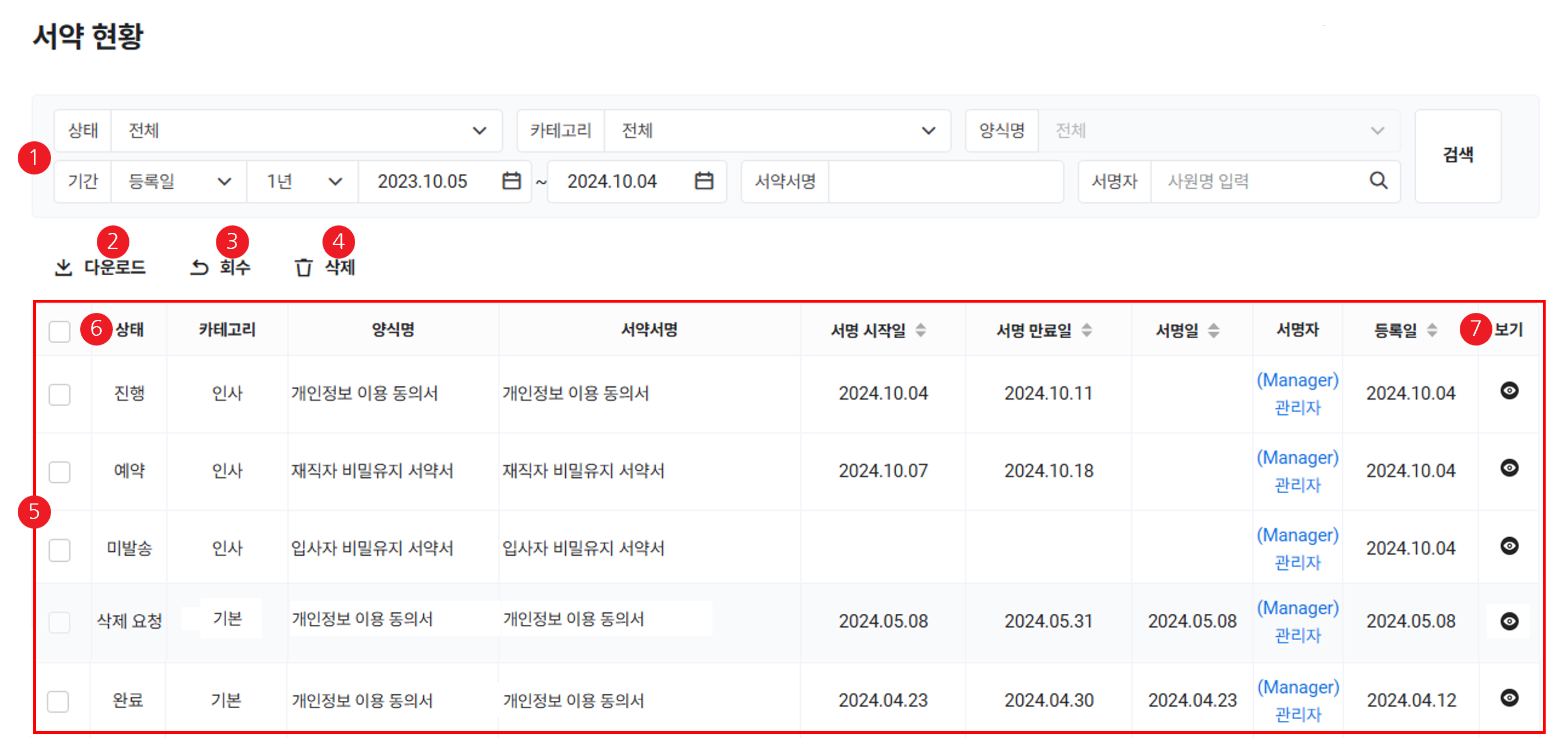 | ⑤ 서약서 목록 | 발송 예약 중이거나 발송된 전체 서약서의 내역 확인 |