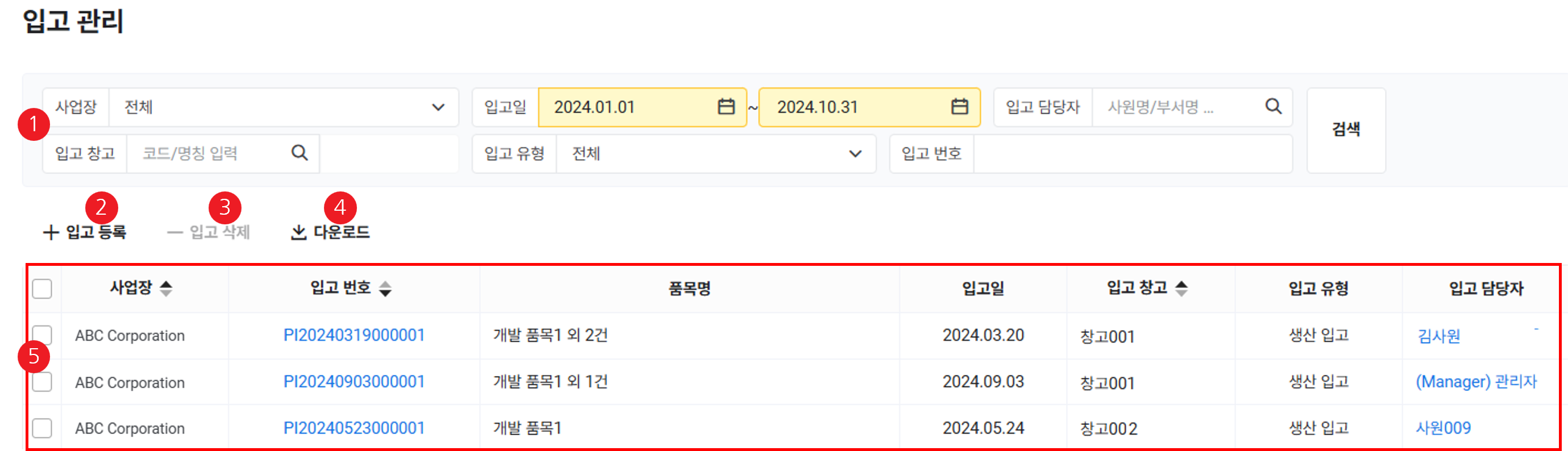 | ① 검색 창 | 사업장, 입고일, 입고 담당자, 입고 창고, 입고 유형 또는 입고 번호 조건에 따라 검색 |