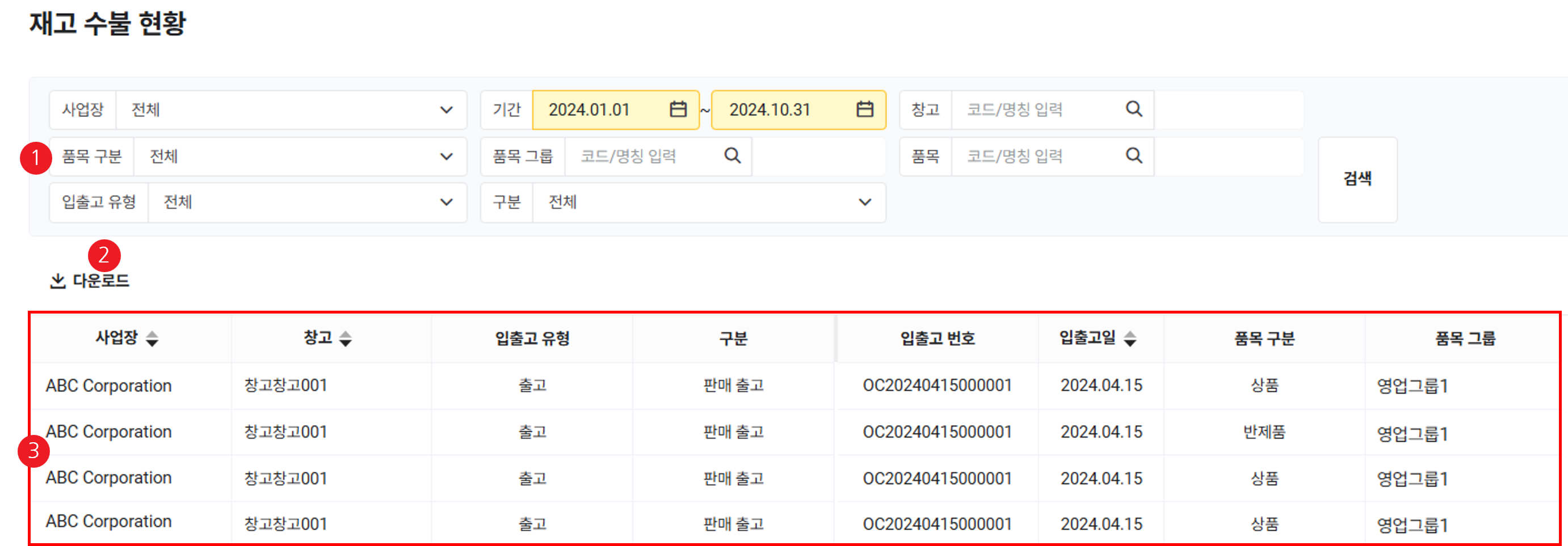 | ① 검색 창 | 사업장, 기간, 창고, 품목 구분, 품목 그룹, 품목, 입출고 유형, 구분 조건에 따라 검색 |