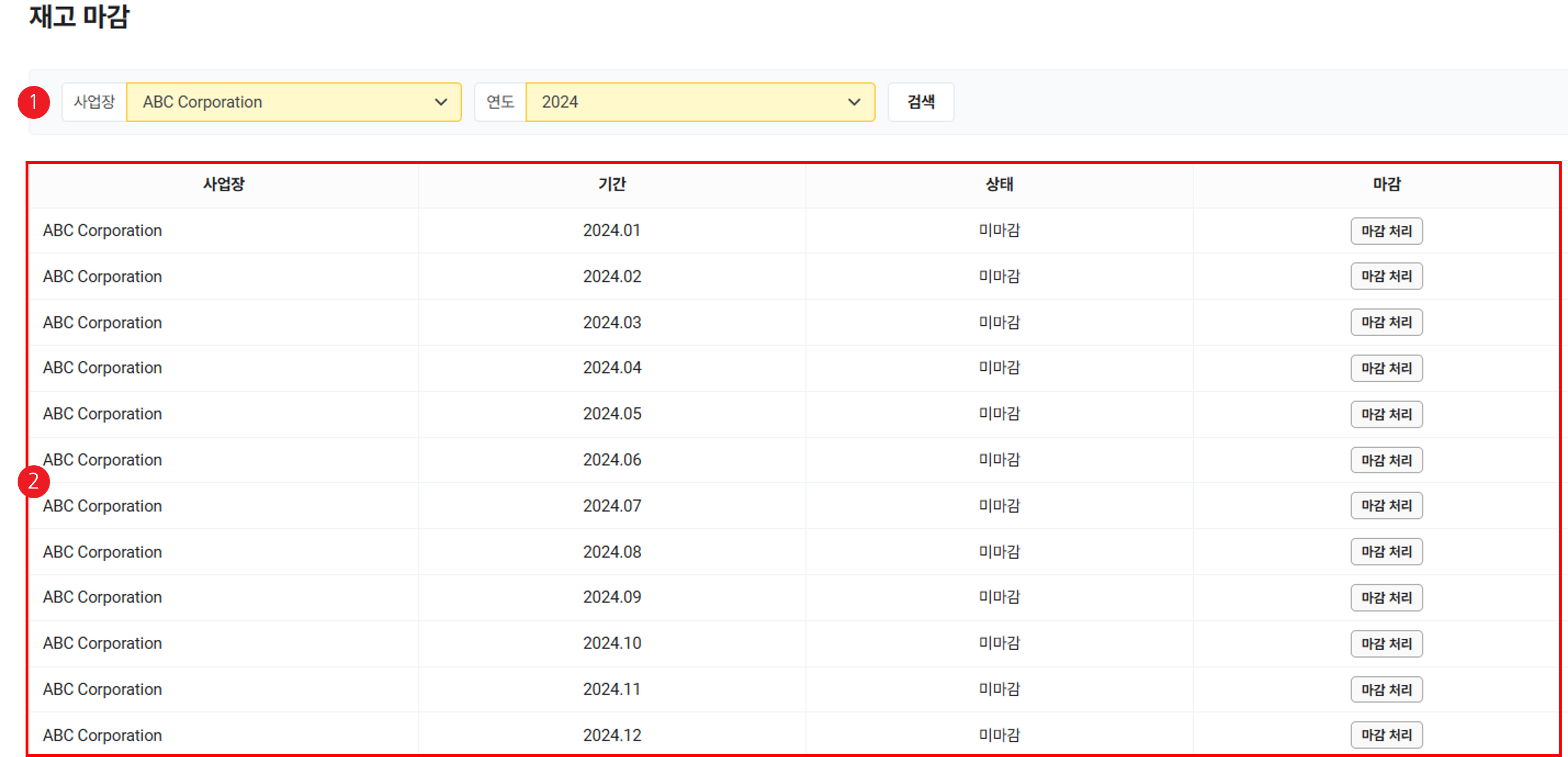 재고 마감 메뉴에서는 사업장별 또는 월별로 재고를 마감해 입출고 처리를 통제할 수 있습니다.