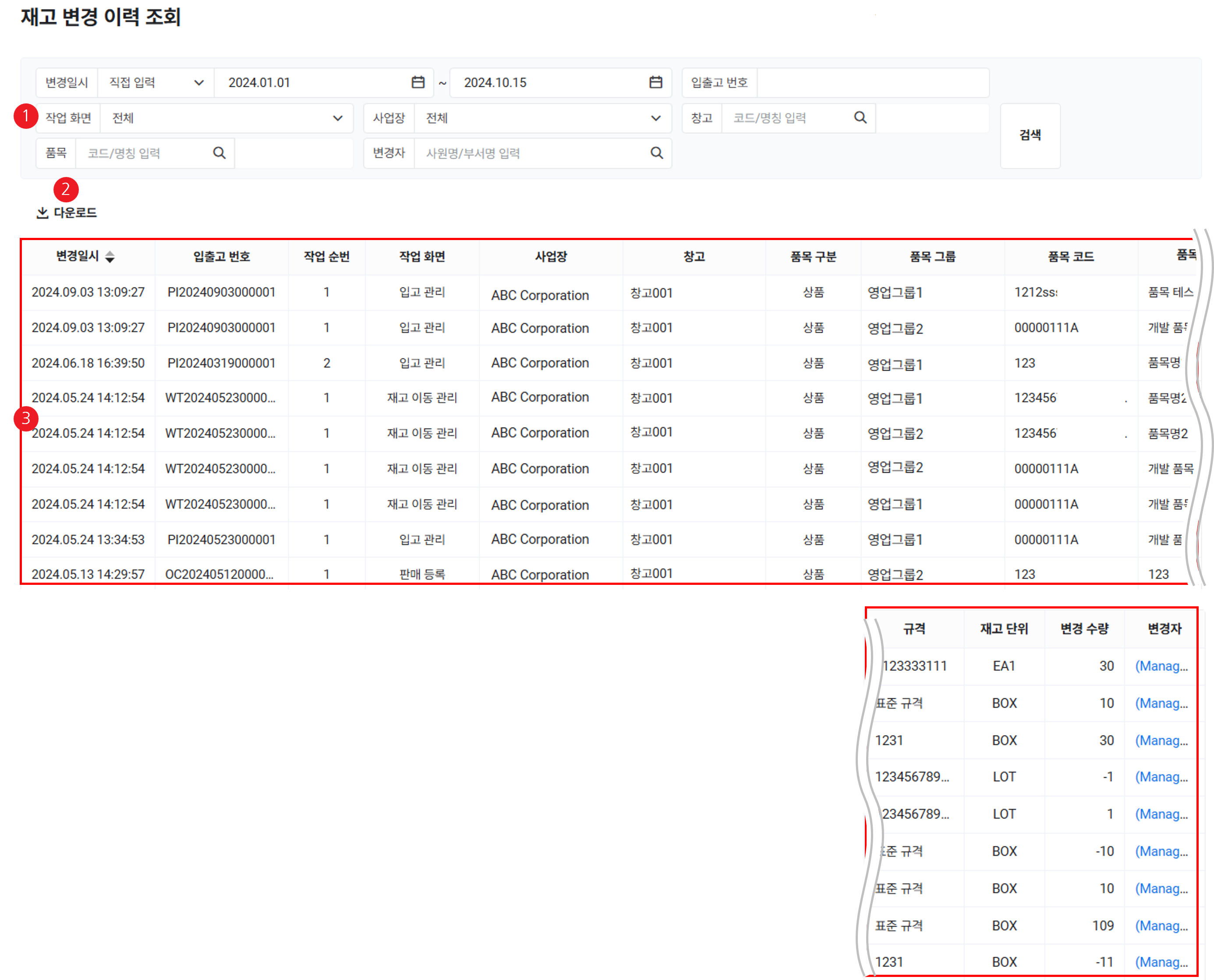 - 입력한 조건에 해당하는 재고 변경 이력이 조회됩니다.