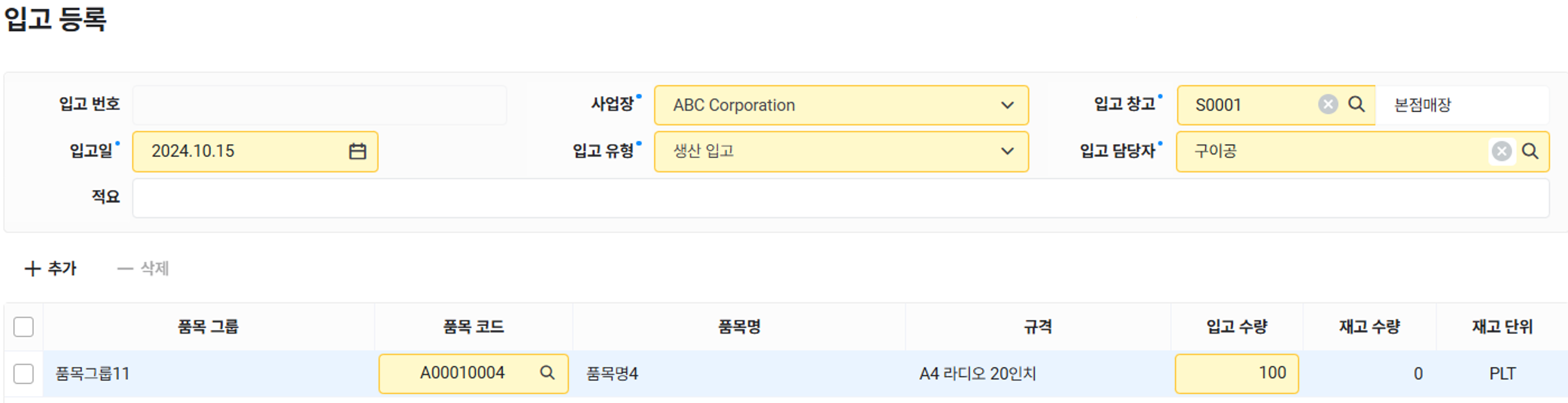 - 입고 담당자: 입고 담당자를 선택합니다.입고 정보를 입력한 후 '추가'를 클릭합니다.