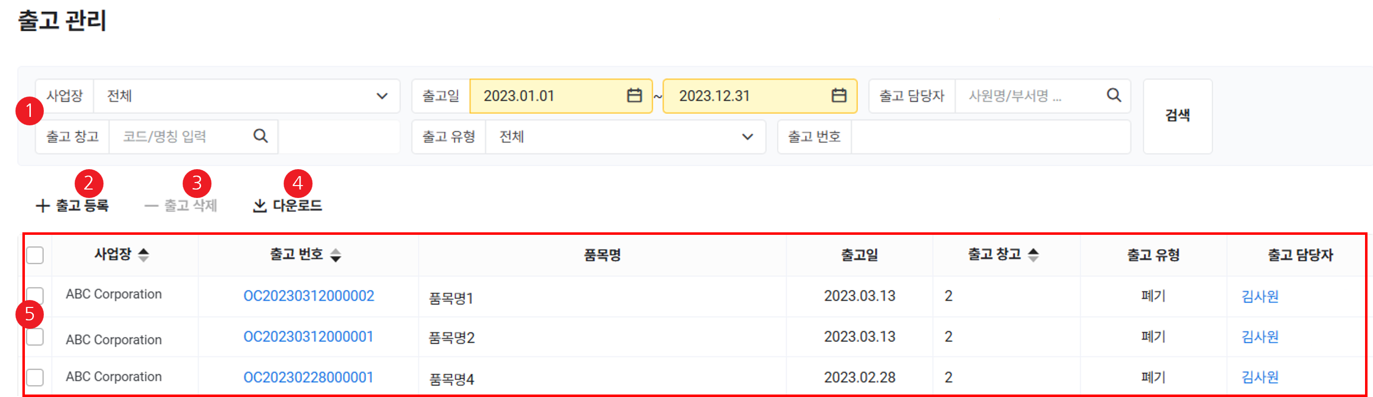 | ① 검색 창 | 사업장, 출고일, 출고 담당자, 출고 창고, 출고 유형, 출고 번호 조건에 따라 검색 |