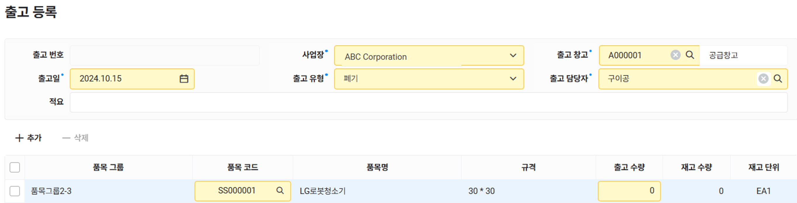 - 출고 담당자: 출고 담당자를 선택합니다. 출고 정보를 입력한 후 '추가'를 클릭합니다.