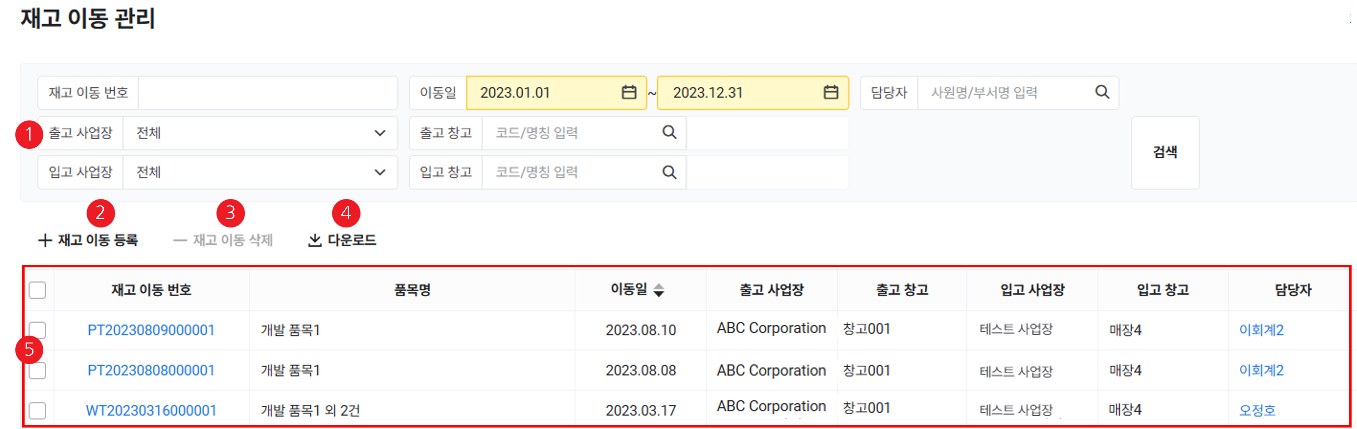 | ① 검색 창 | 재고 이동 번호, 이동일, 담당자, 출고 사업장, 출고 창고, 입고 사업장, 입고 창고 조건에 따라 검색 |