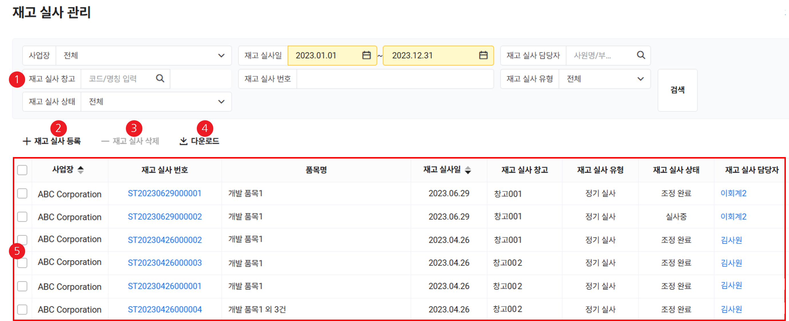 | ⑤ 재고 실사 내역 목록 | 재고 실사 내역 목록 조회
