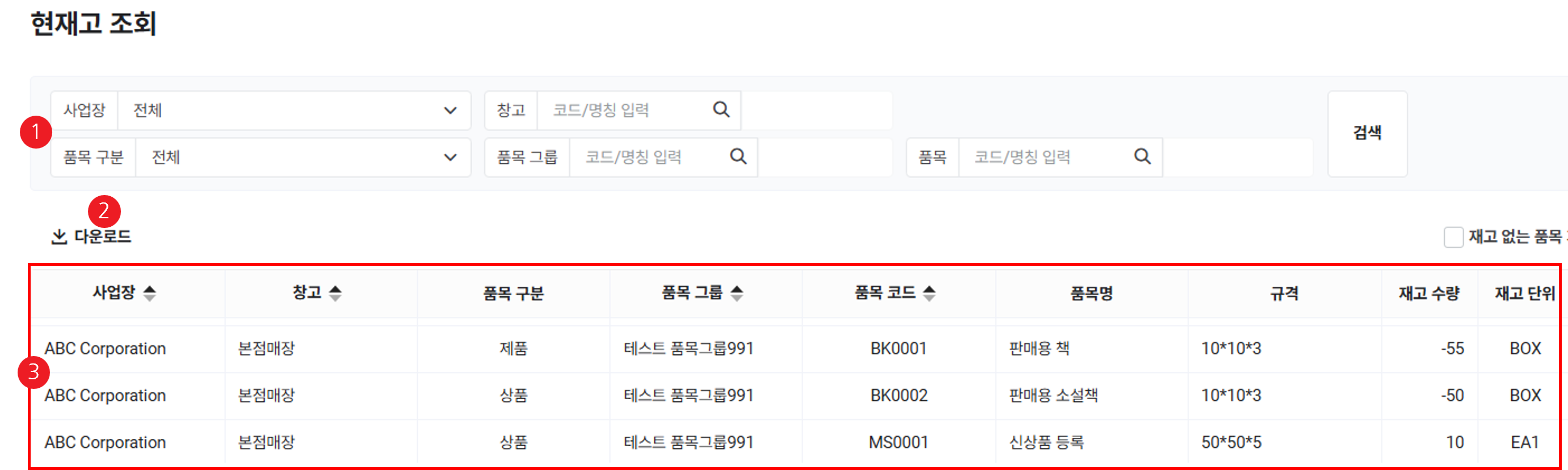 - 입력한 조건에 해당하는 현재 재고 현황이 조회됩니다.