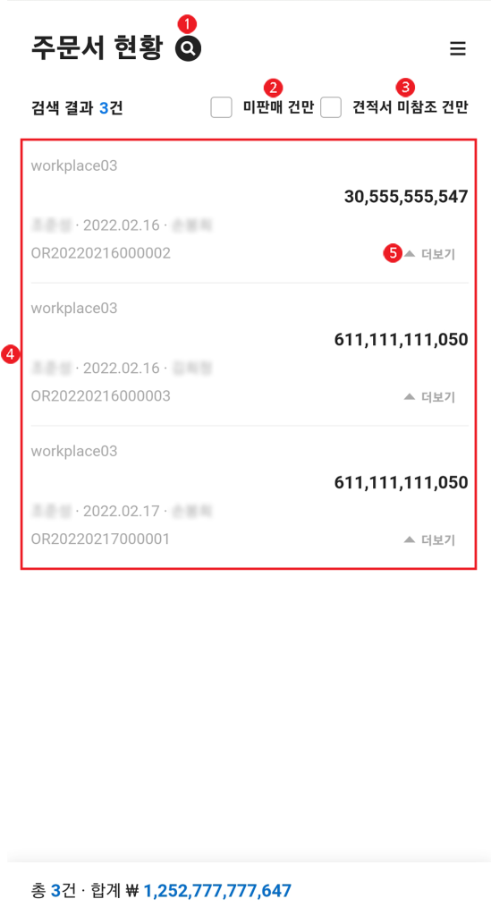 | ⑤ 더보기 | 주문서의 상세 내용 확인 |