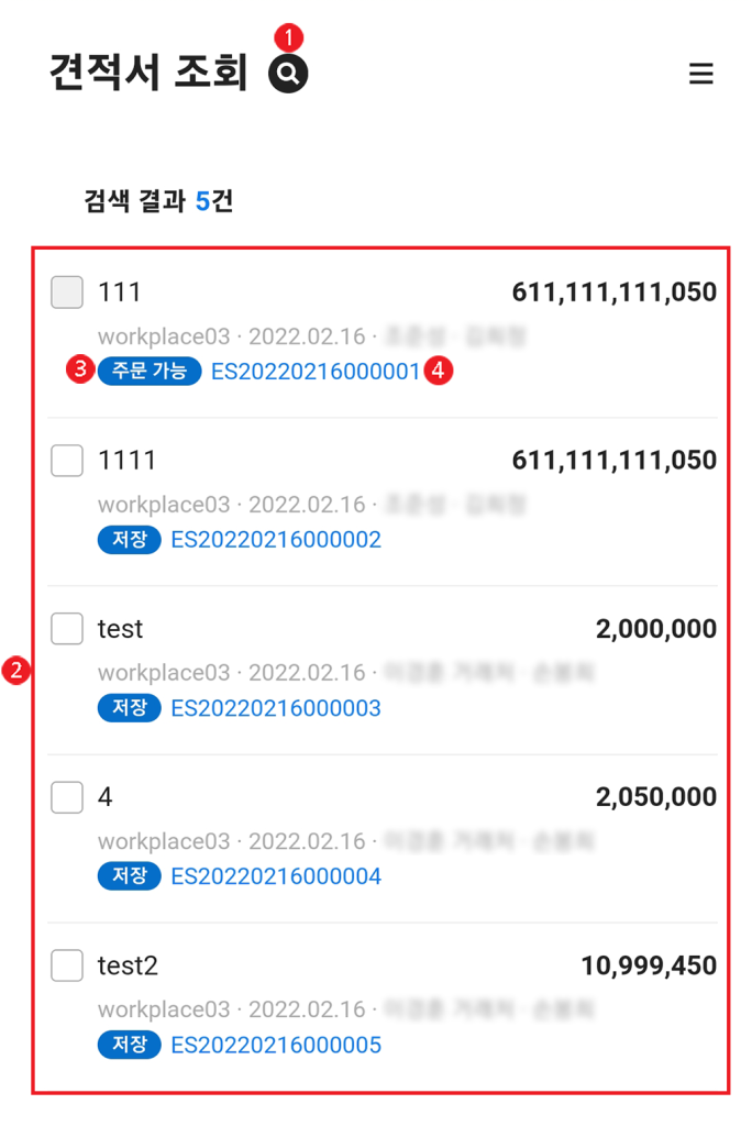 | ② 견적서 목록 | 입력한 조건에 따라 견적서 목록 표시 |