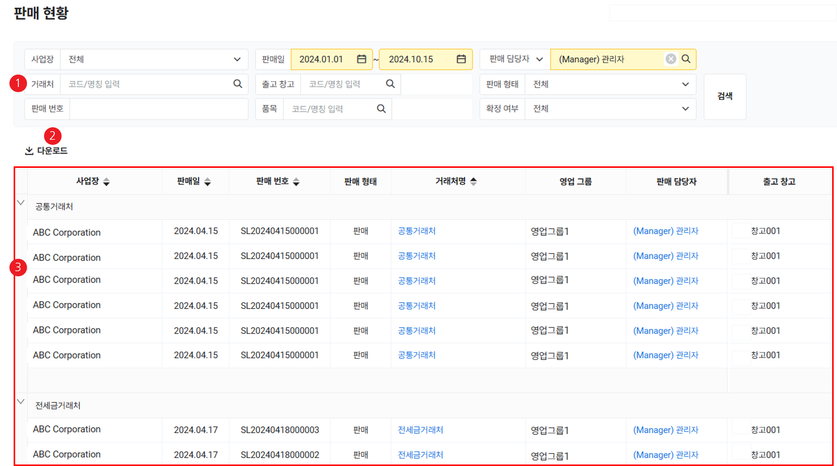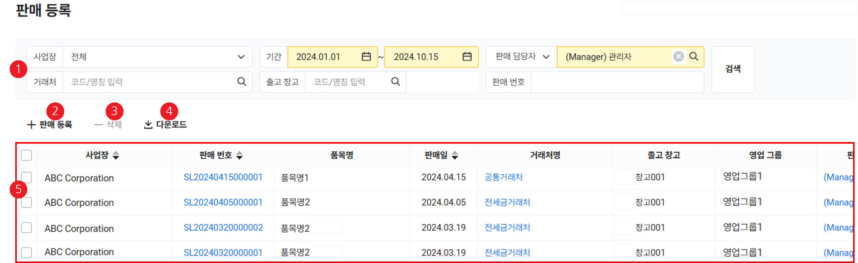 | ① 검색 창 | 사업장, 기간, 판매 담당자 또는 영업 그룹, 거래처, 출고 창고, 판매 번호 조건에 따라 검색 |