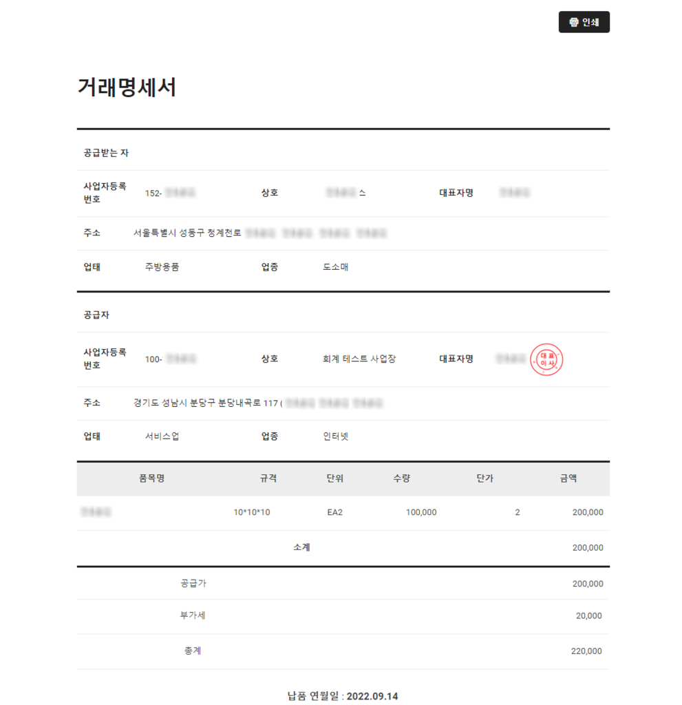 - 거래명세서 '인쇄'를 클릭합니다.