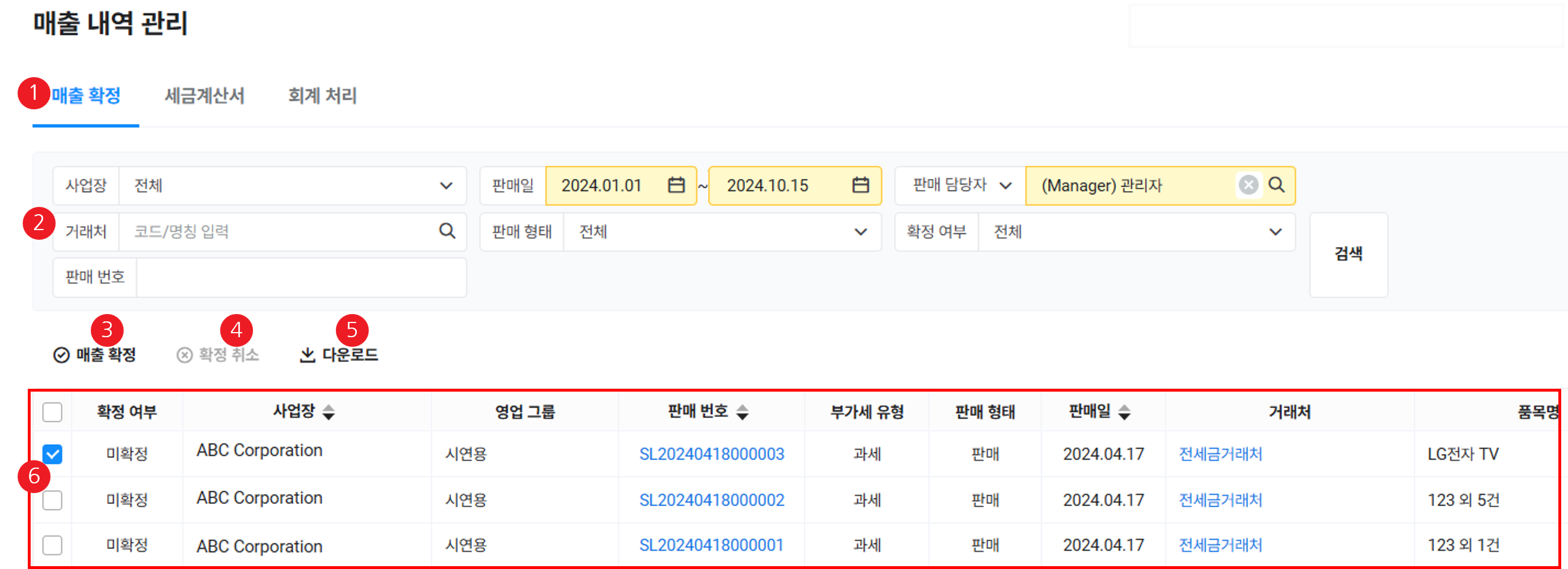 매출 확정 화면은 다음과 같이 구성되어 있습니다.