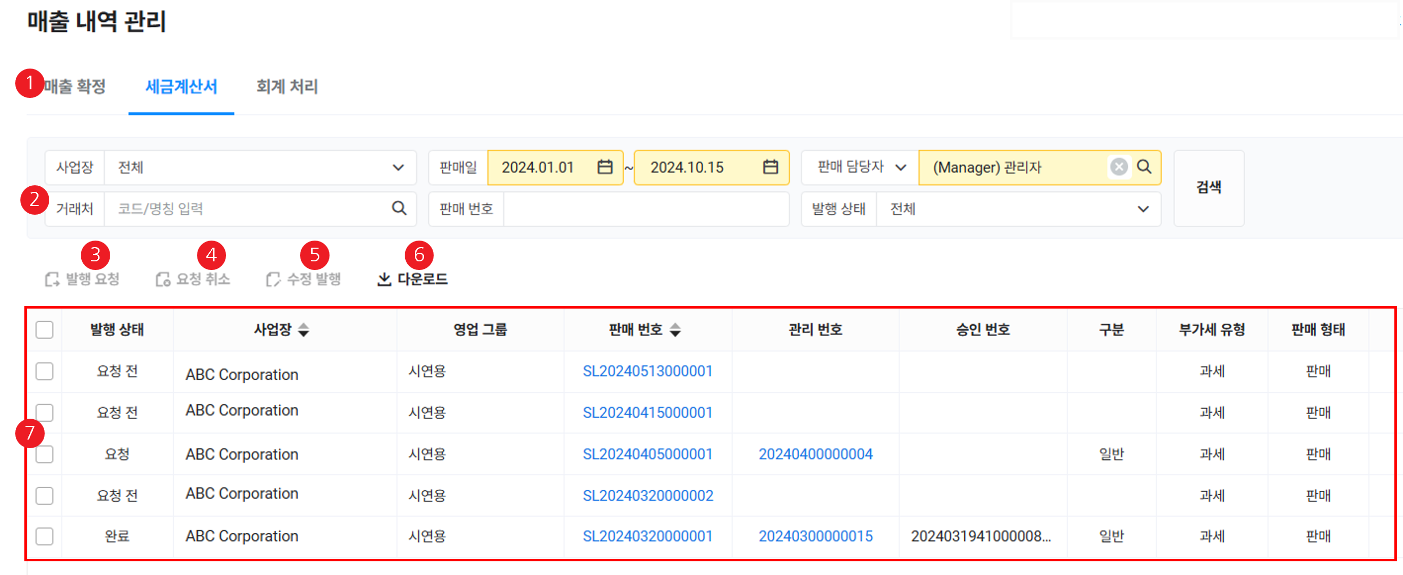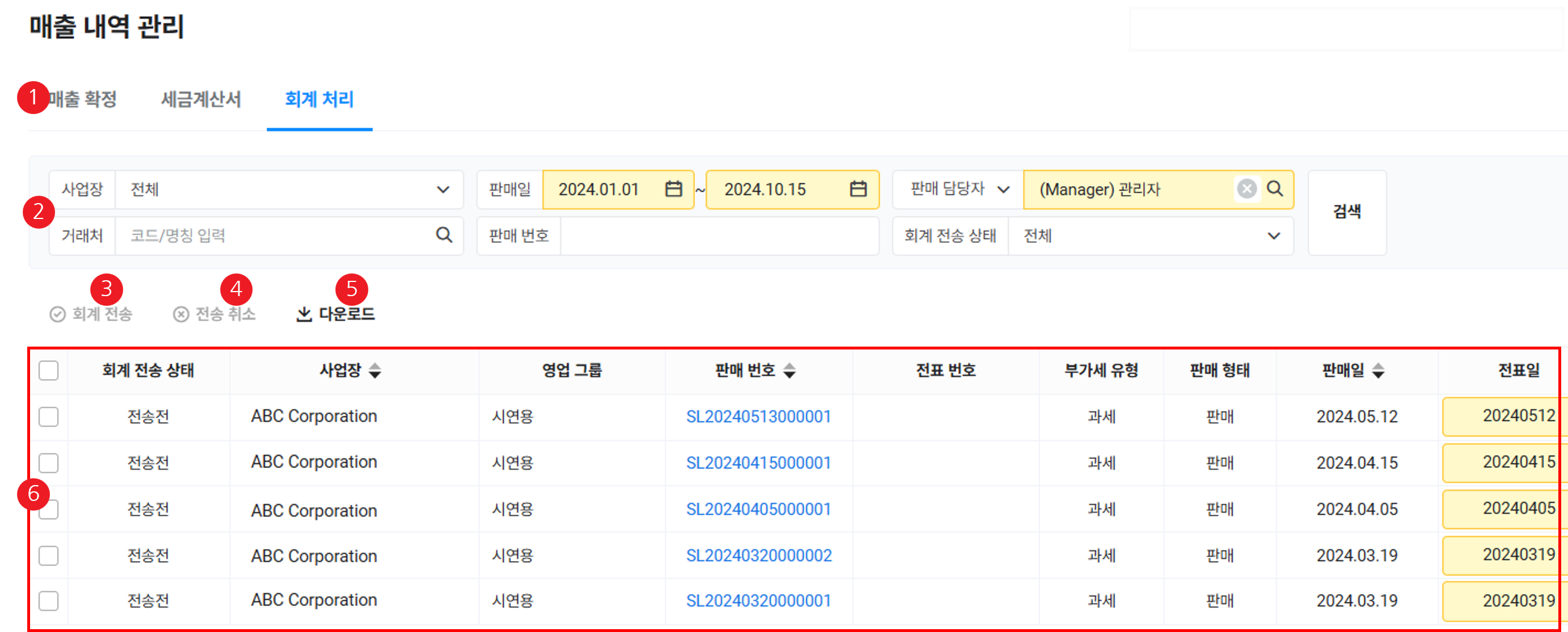 | ② 검색창 | 매출 자료를 사업장, 판매일, 판매 담당자(영업 그룹), 거래처, 판매 번호, 회계 전송 상태 조건에 따라 검색 |