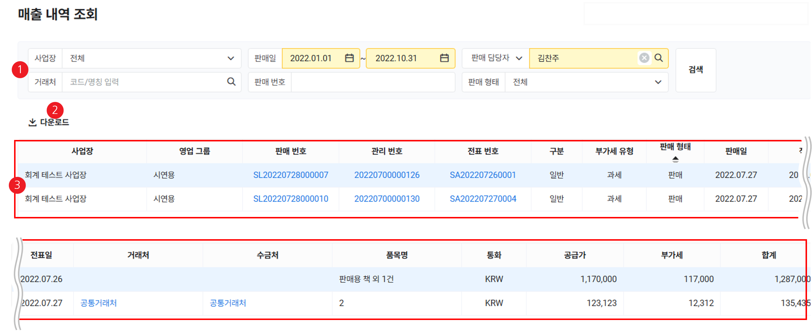 | ② 다운로드 | 매출 내역을 엑셀 파일로 다운로드(매출 내역 목록 다운로드 참조) |
