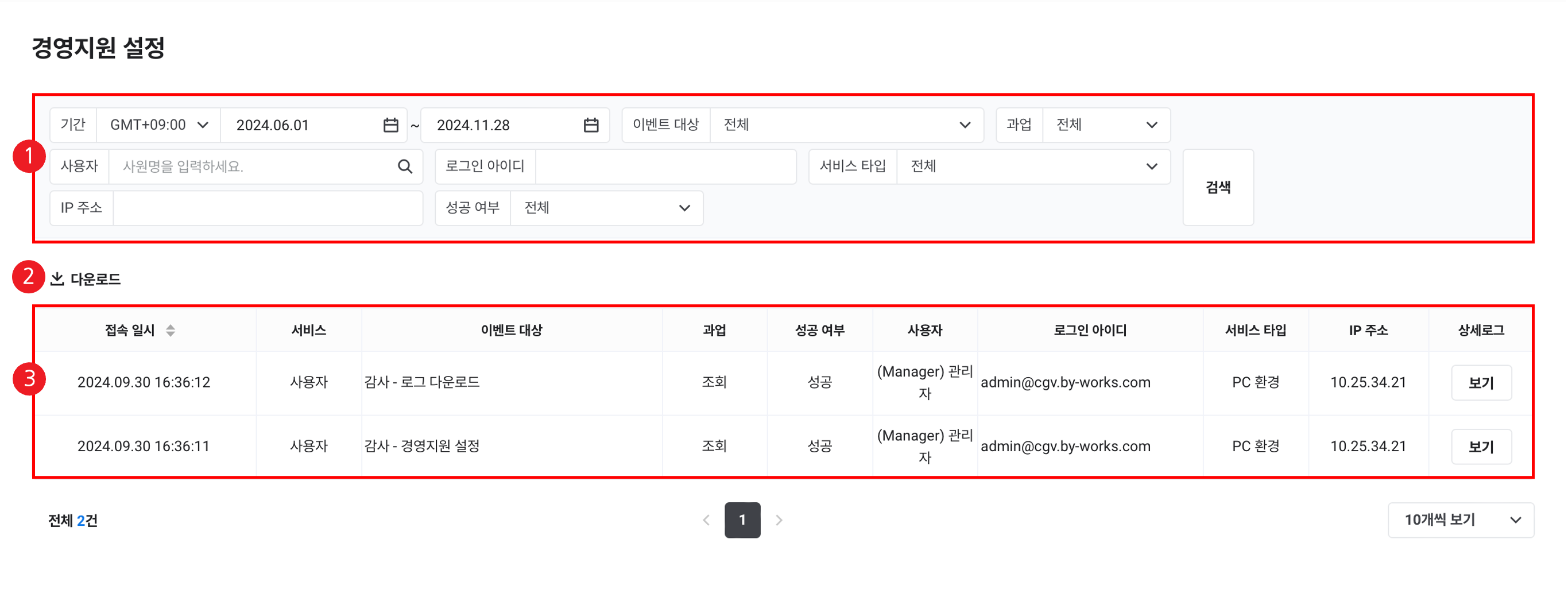 관리자의 로그 감사 이력을 조회하고 상세 로그를 다운로드할 수 있습니다.