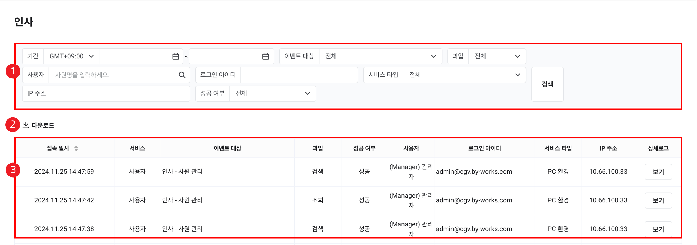 인사 로그를 조회하고 다운로드하는 방법은 다음과 같습니다.