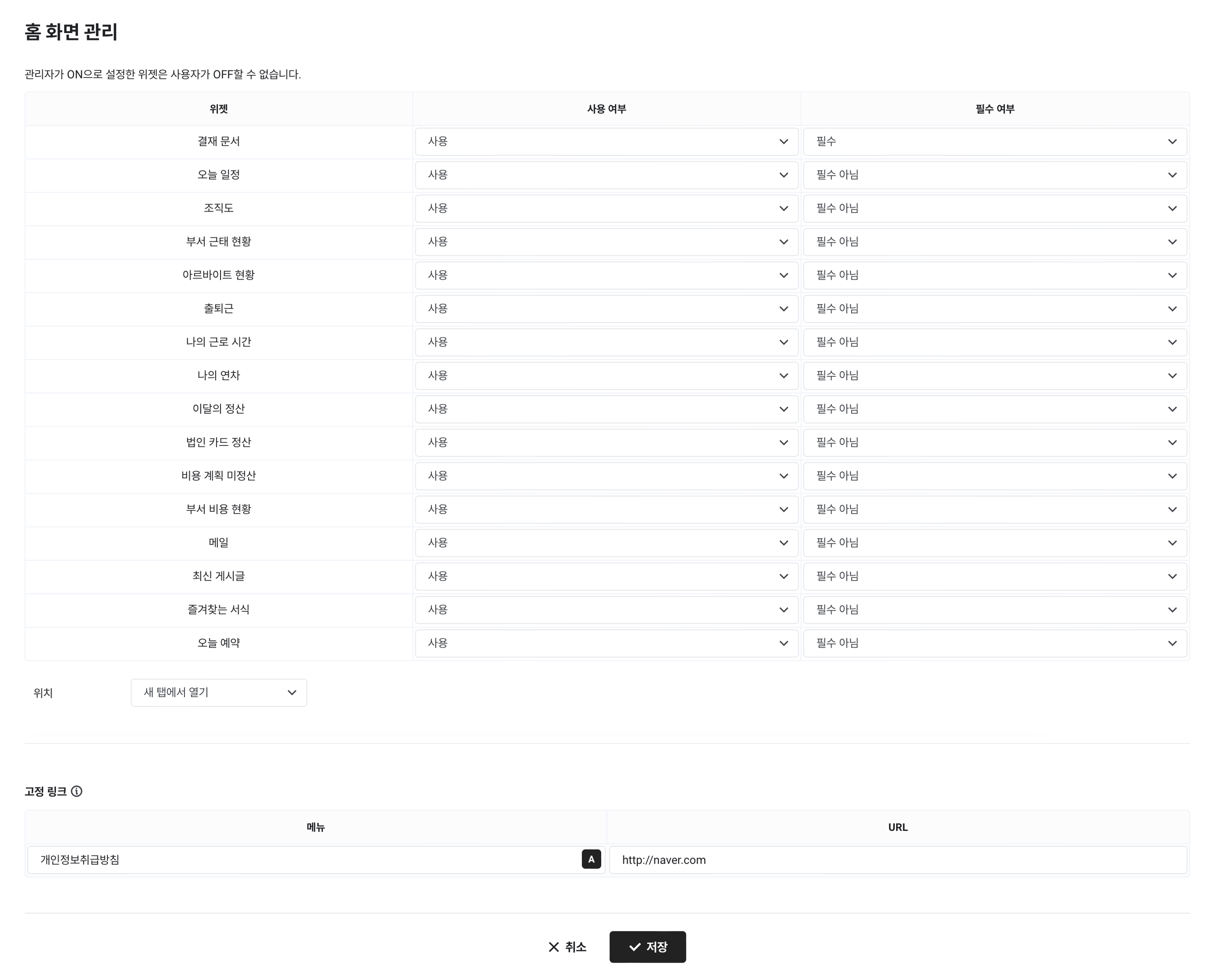 홈 화면의 우측 상단에 표시할 고정 링크 메뉴를 설정할 수 있습니다.