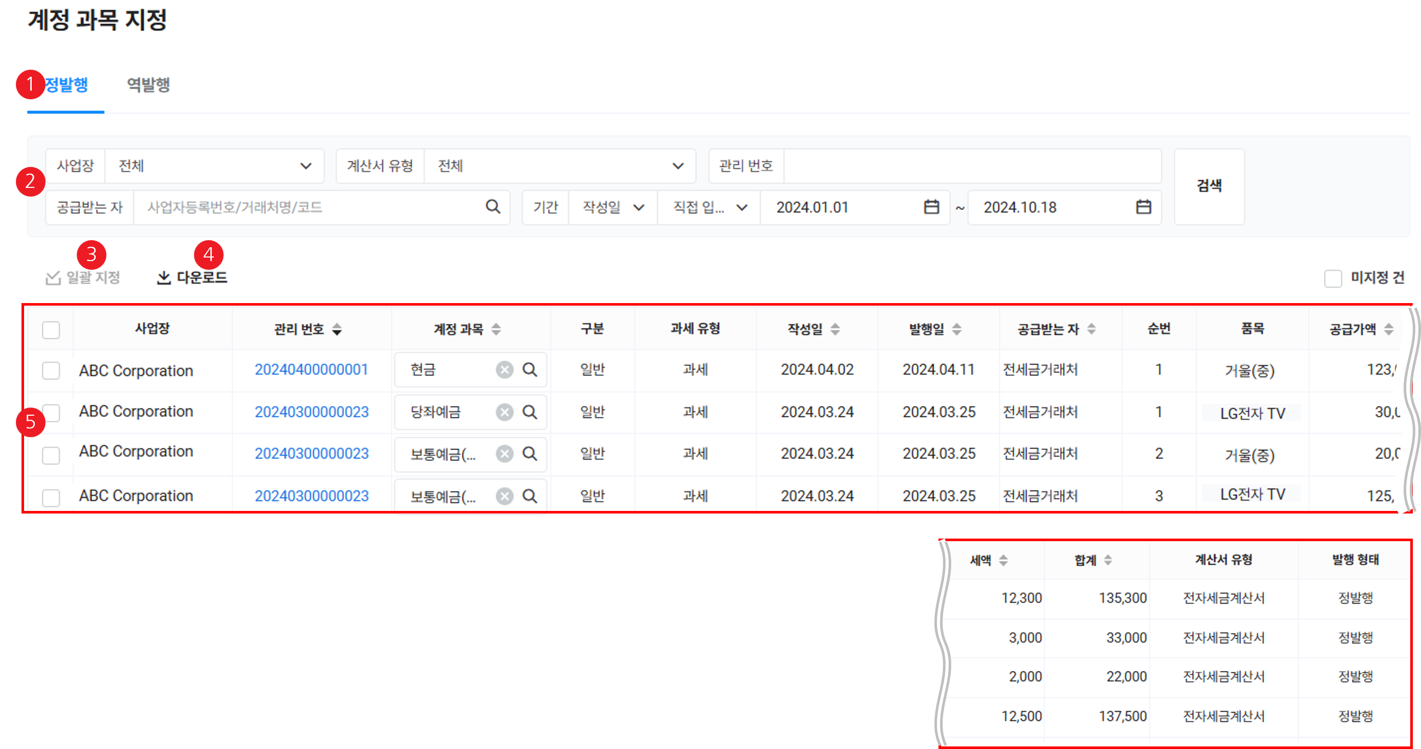 - 여러 건의 계산서 선택 후 '일괄 지정'을 클릭하여 계정 과목을 일괄 지정할 수 있습니다.