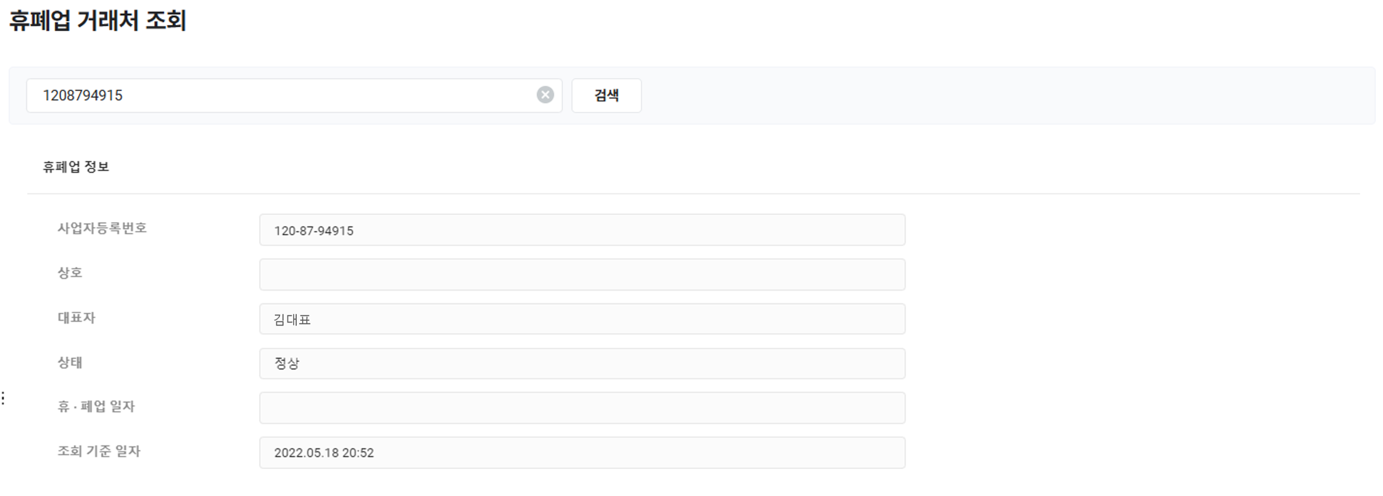 - 거래처의 휴폐업 조회 결과가 표시됩니다. 휴폐업 거래처인 경우 휴폐업 일자가 조회됩니다.