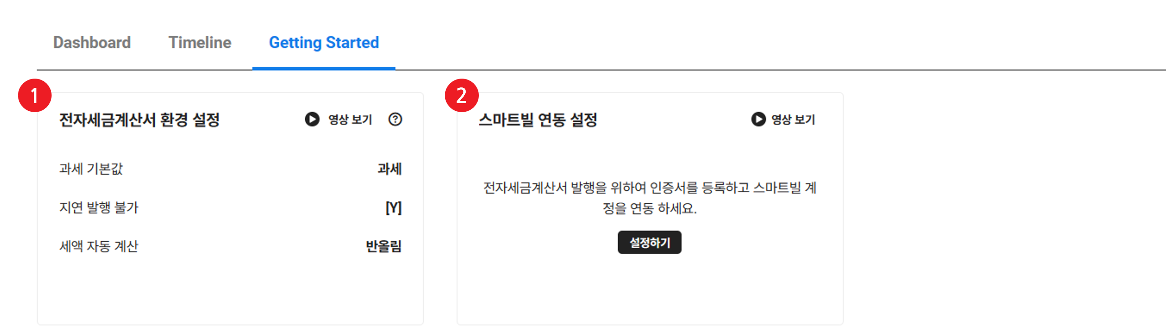 전자세금계산서 서비스를 원활히 사용하기 위해서는 Getting Started 화면의 카드 순서에 따라 모든 항목의 설정을 완료해 주십시오.