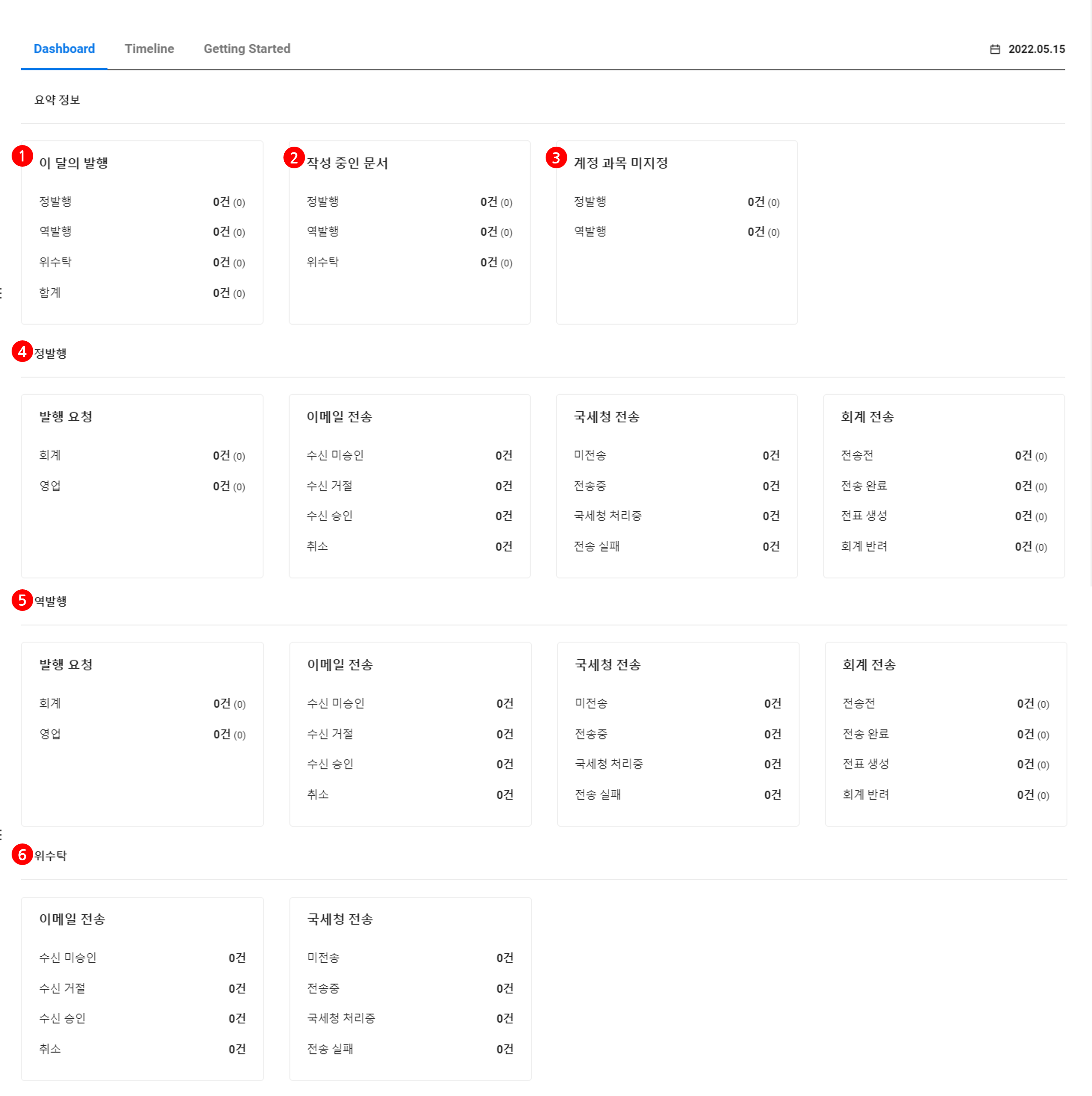 Getting Started 화면의 모든 설정을 완료한 후에는, 전자세금계산서 서비스에 접속하면 Dashboard 화면이 나타납니다. Dashboard 화면에는 전자세금계산서 관련 요약 정보가 카드 형태로 표시됩니다.