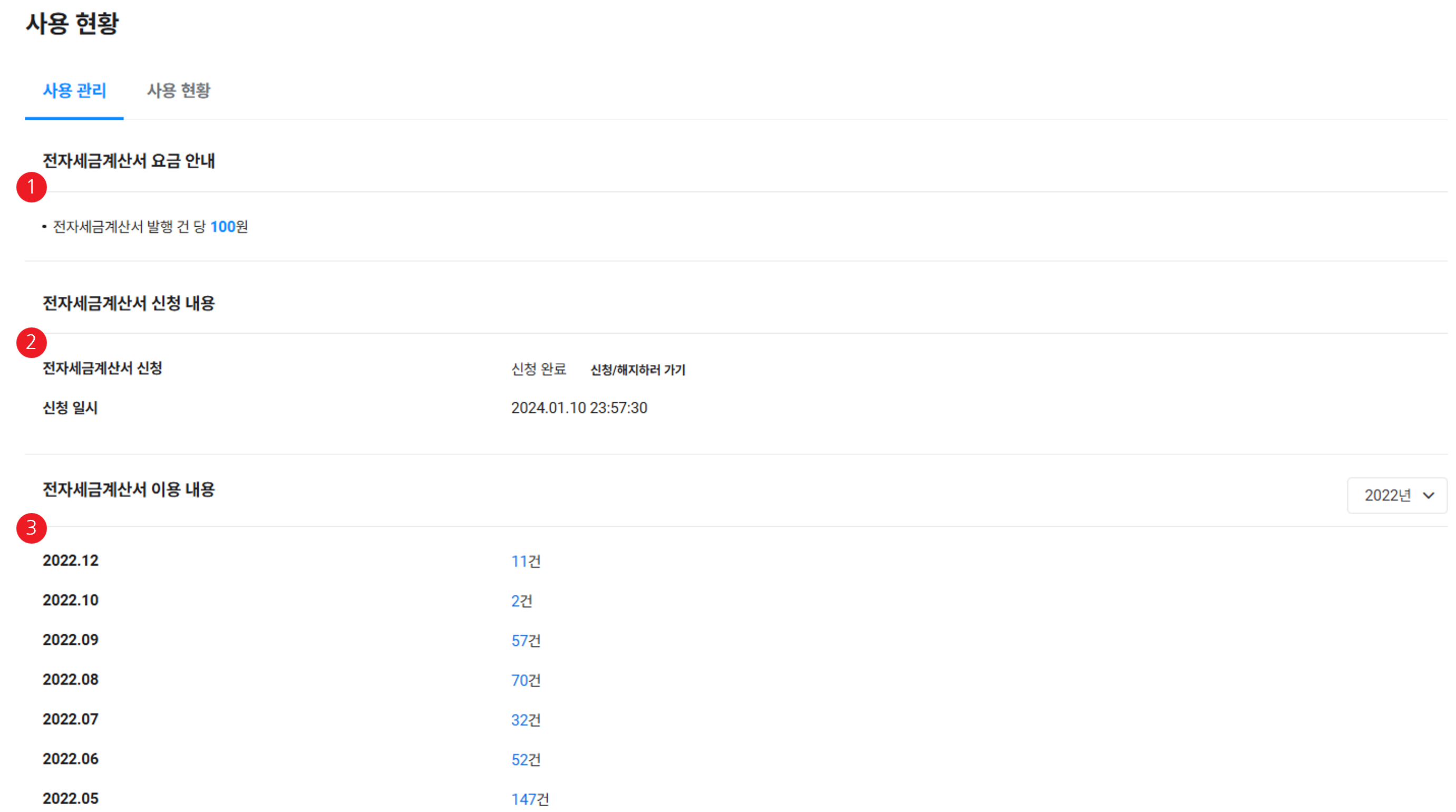 | ③ 전자세금계산서 이용 내용 | 연/월별 사용 건수 표시 |