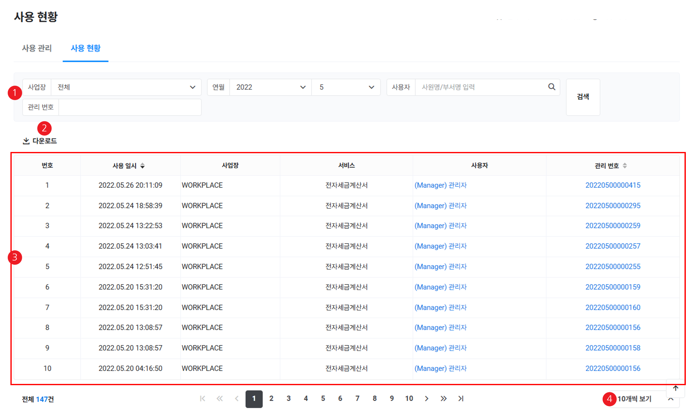 | ① 검색창 | 전자세금계산서 사용 내역을 사업장, 연/월, 사용자, 관리번호에 따라 검색 |