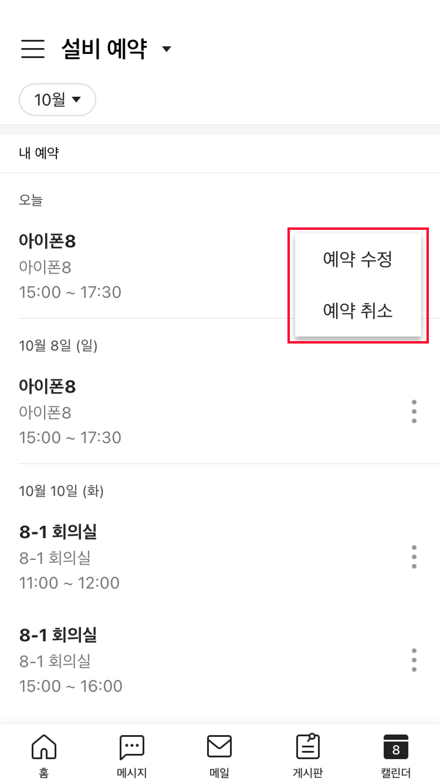 캘린더 일정 쓰기에서 예약한 설비도 '내 예약'에서 함께 확인할 수 있습니다.