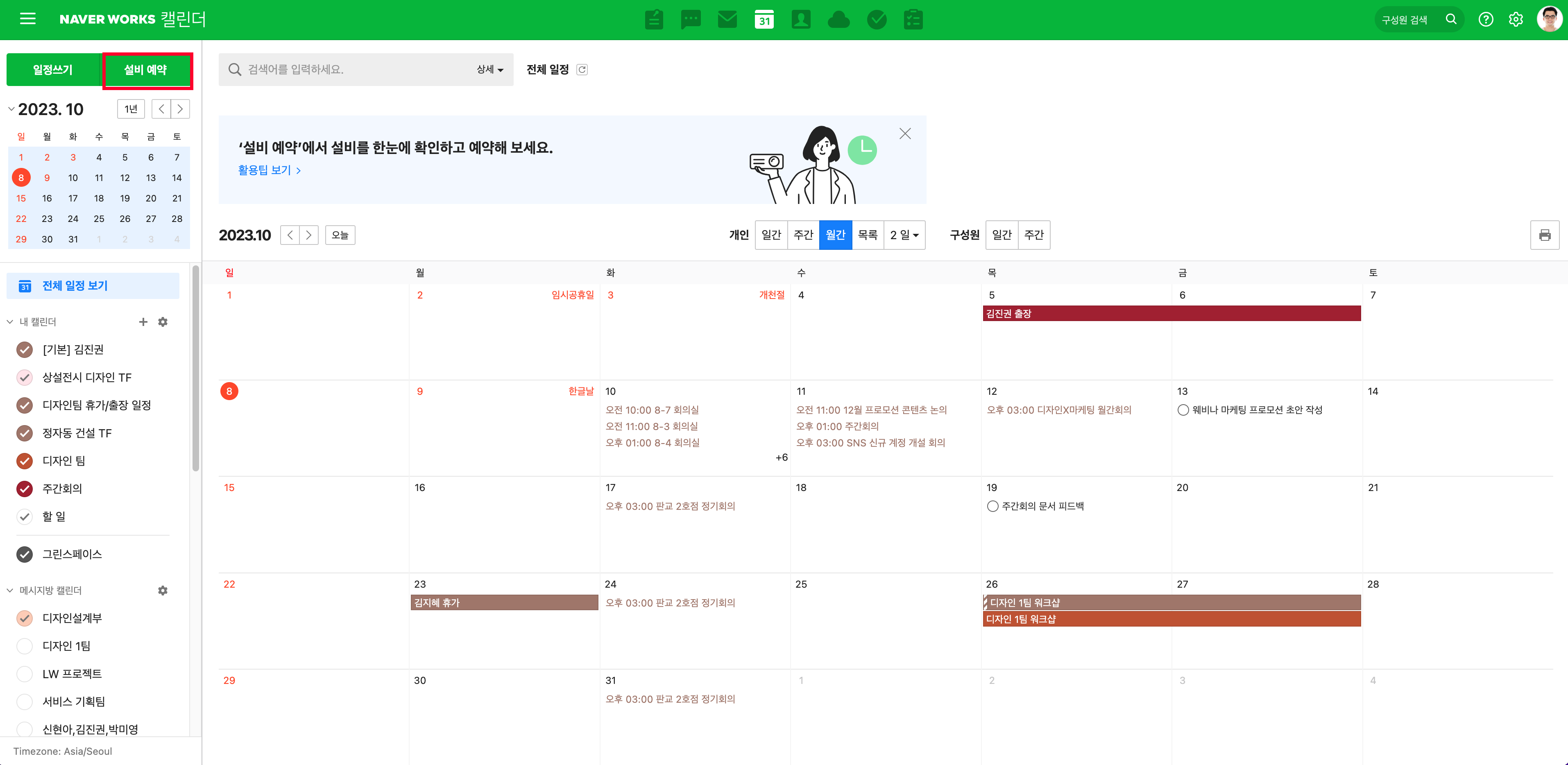 캘린더 왼쪽 상단 영역 또는 왼쪽 메뉴에서 '설비 예약'을 선택해보세요.