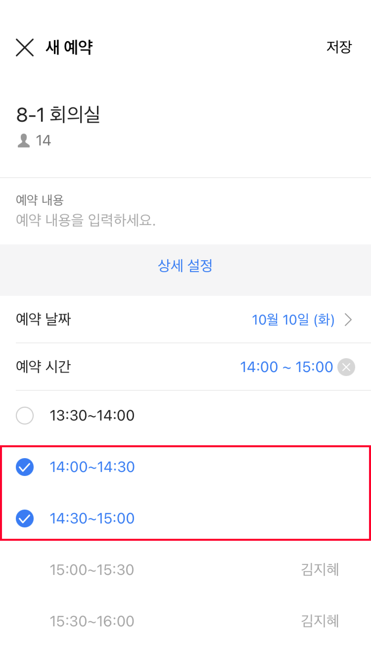 선택이 불가한 시간은 오른편의 예약자명을 통해 예약자가 누구인지 확인할 수 있습니다.