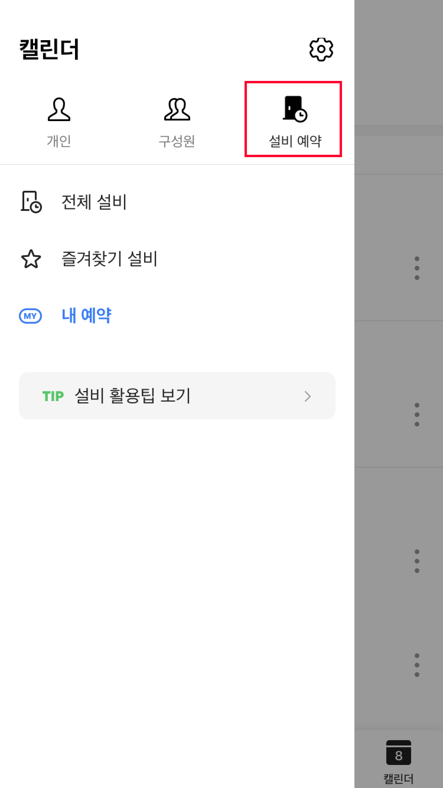 캘린더 왼쪽 상단 영역 또는 왼쪽 메뉴에서 '설비 예약'을 선택해보세요.