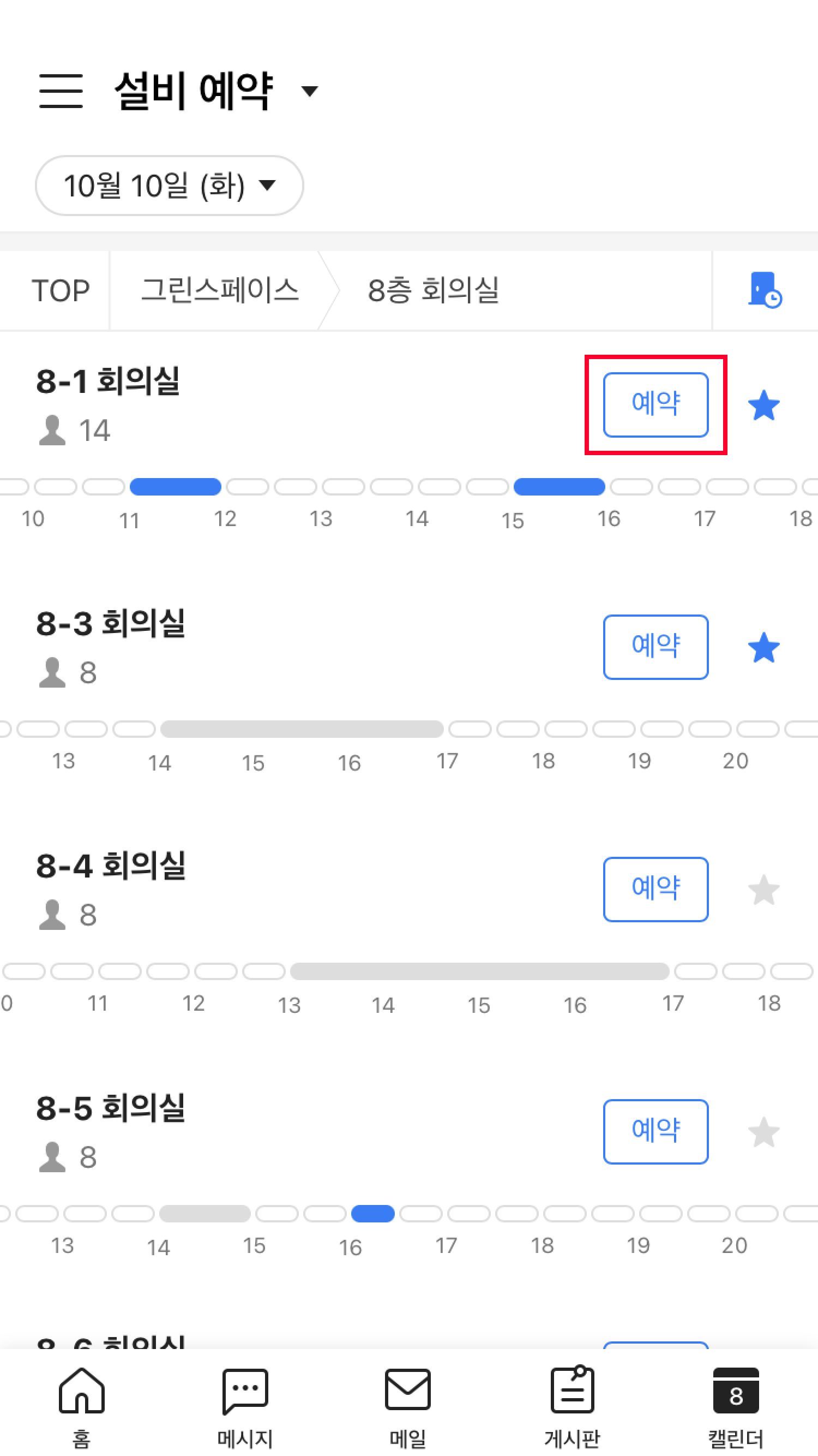 모바일에서 예약하고 싶은 설비의 빈 시간 확인 후 '예약' 버튼을 탭하세요.