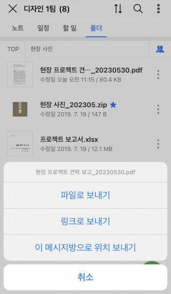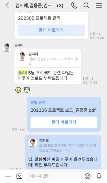 함께 봐야 하는 업무 자료는 메시지방 폴더에 업로드해보세요.